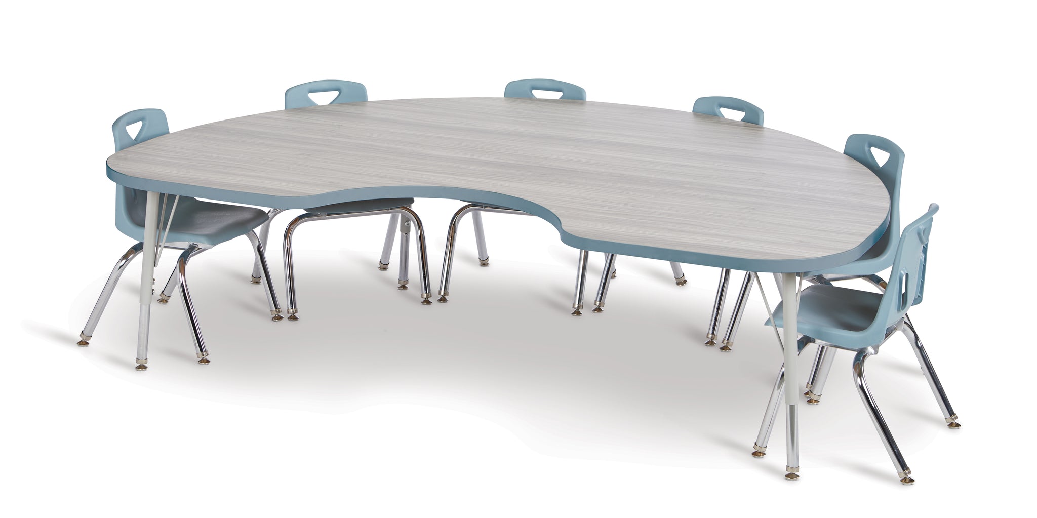 Educators can easily interact with individual children without disturbing others with Kidney Tables. Accommodates up to 8 chairs. The legs feature glides that reduce noise, prevent snags, and resist rust. Driftwood Gray tabletop with Coastal Blue TRUEdge and Gray legs.