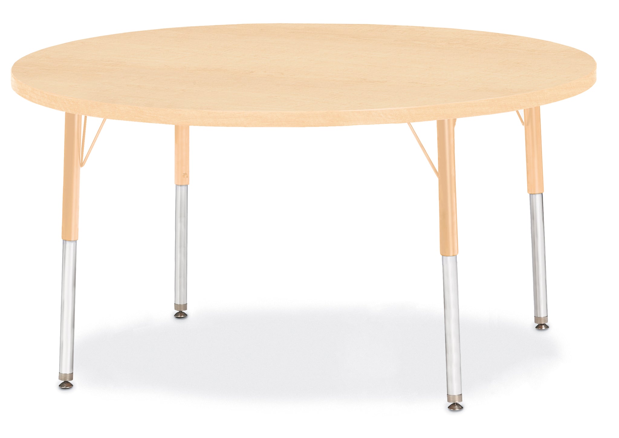 These round tables are excellent for allowing children to interact with each other during projects. Accommodates up to 6 chairs. The legs feature glides that reduce noise, prevent snags, and resist rust. Maple tabletop with maple TRUEdge and camel legs.