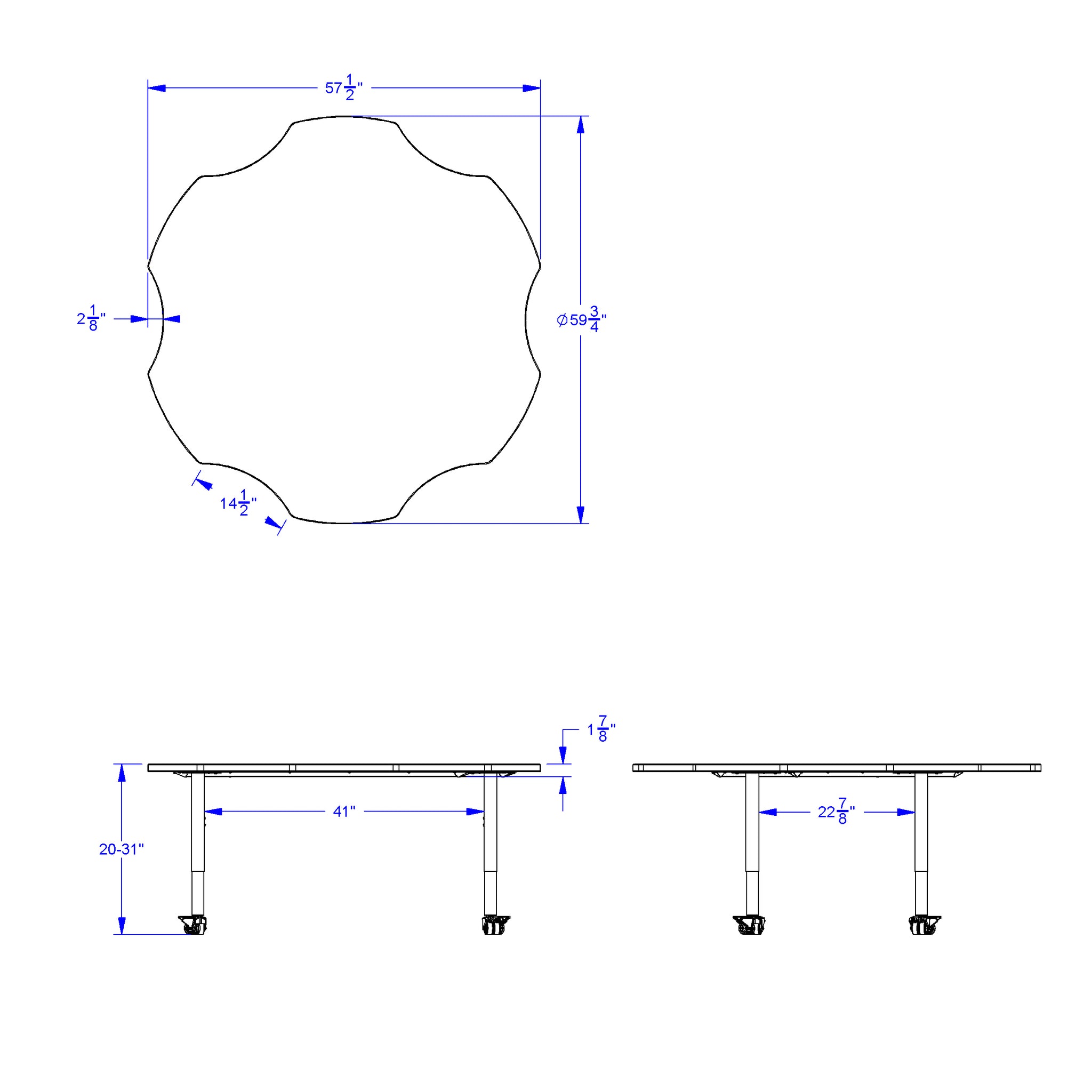 Perfect seating area for any early learning space. Accommodates up to 6 chairs. The legs adjust from 20” to 31” high, are 2” thick, and feature heavy-duty casters. Freckled gray tabletop with navy TRUEdge, gray legs, and gray casters.