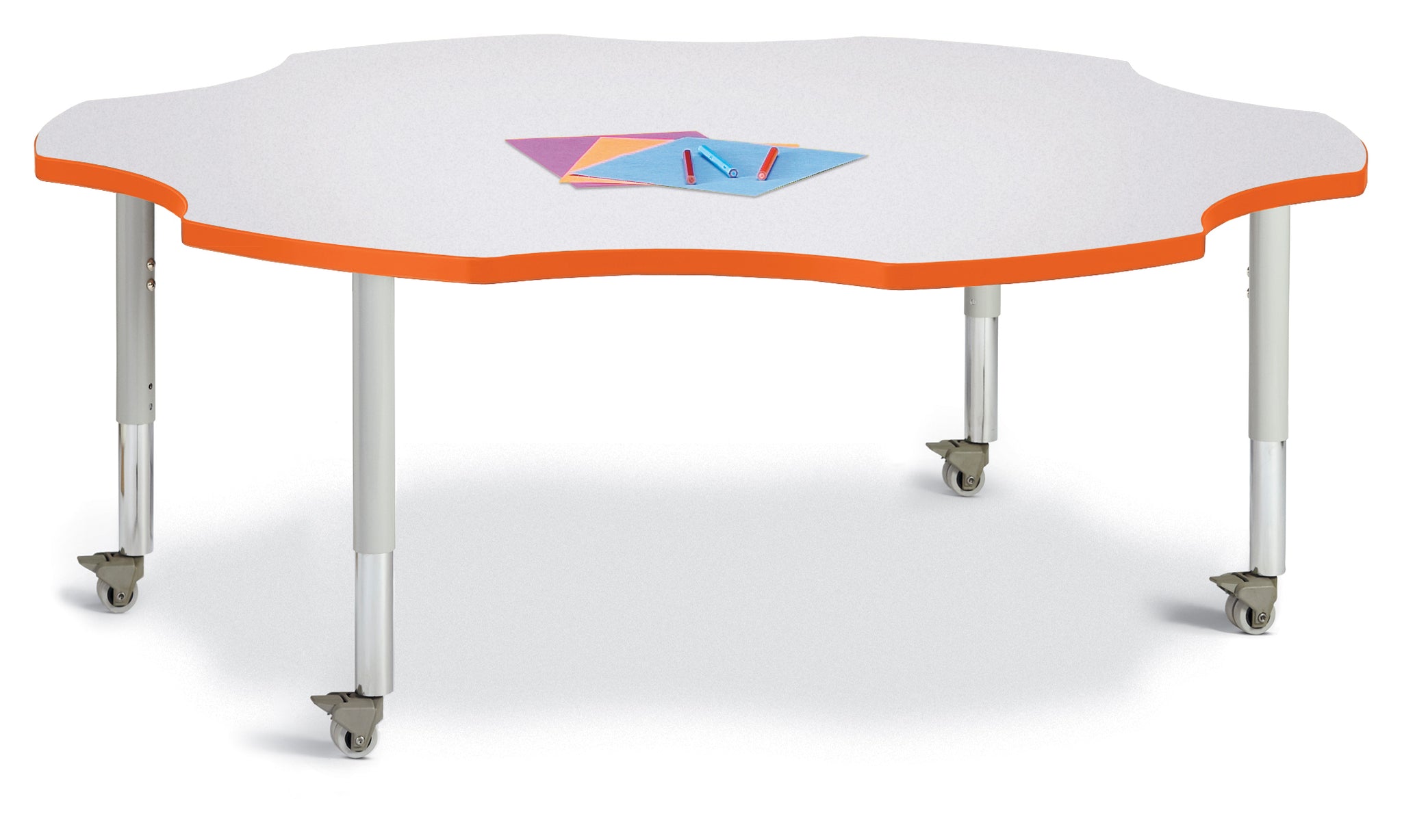 Perfect seating area for any early learning space. Accommodates up to 6 chairs. The legs adjust from 20” to 31” high, are 2” thick, and feature heavy-duty casters. Freckled gray tabletop with orange TRUEdge, gray legs, and gray casters.