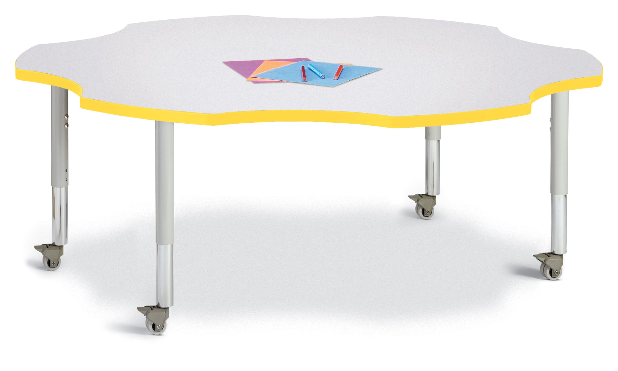 Perfect seating area for any early learning space. Accommodates up to 6 chairs. The legs adjust from 20” to 31” high, are 2” thick, and feature heavy-duty casters. Freckled gray tabletop with yellow TRUEdge, gray legs, and gray casters.