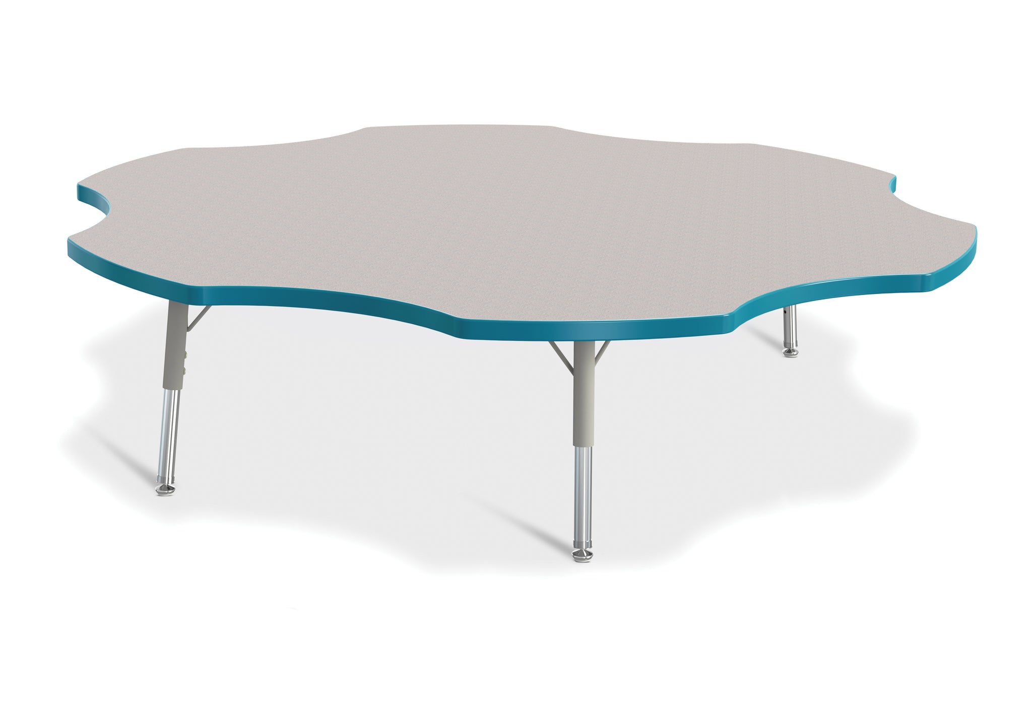 Perfect seating area for any early learning space. Accommodates up to 6 chairs. The legs feature glides that reduce noise, prevent snags, and resist rust. Freckled gray tabletop with teal TRUEdge and gray legs.