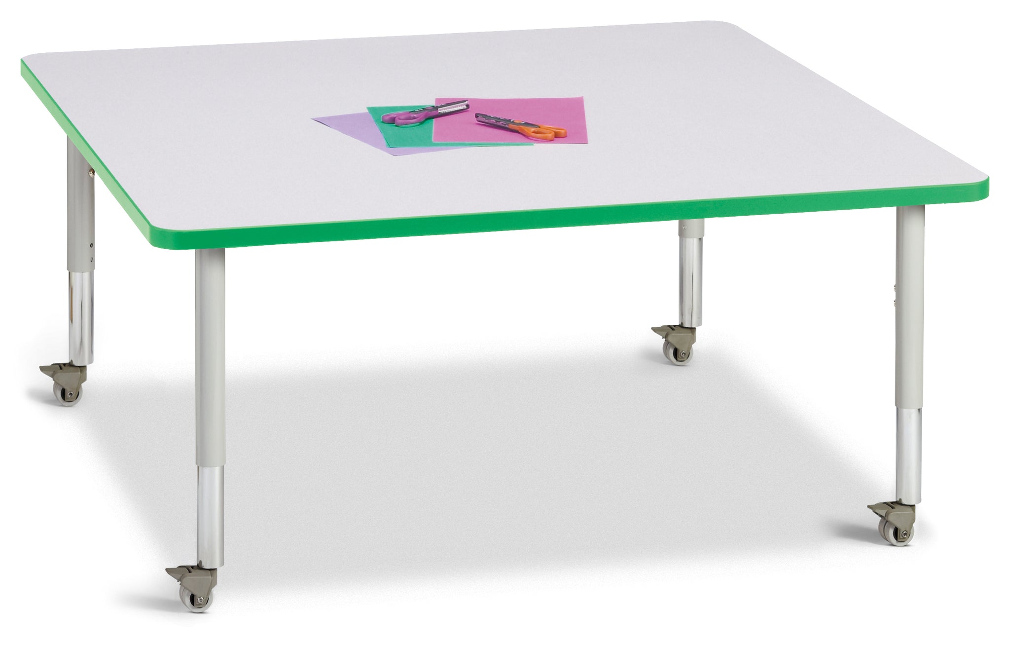 Keep it simple with a square table. Accommodates up to 8 chairs. The legs adjust from 20” to 31” high, are 2” thick, and feature heavy-duty casters. Freckled gray tabletop with green TRUEdge, gray legs, and gray casters.