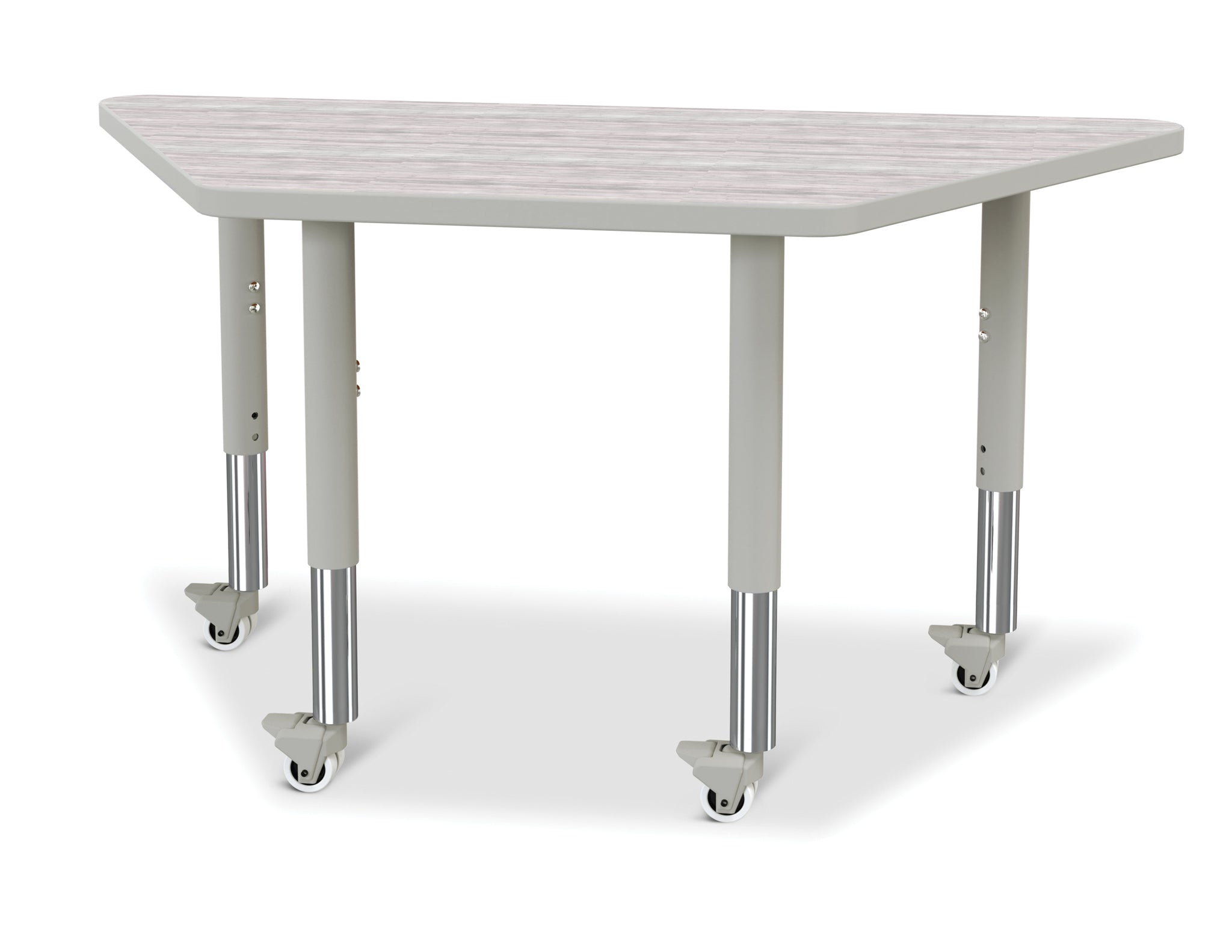 Great for students of any age, multiple trapezoid tables can be arranged in many configurations to accommodate any space. Accommodates up to 5 chairs. The legs adjust from 20” to 31” high, are 2” thick, and feature heavy-duty casters. Driftwood Gray tabletop with gray TRUEdge, gray legs, and gray casters.
