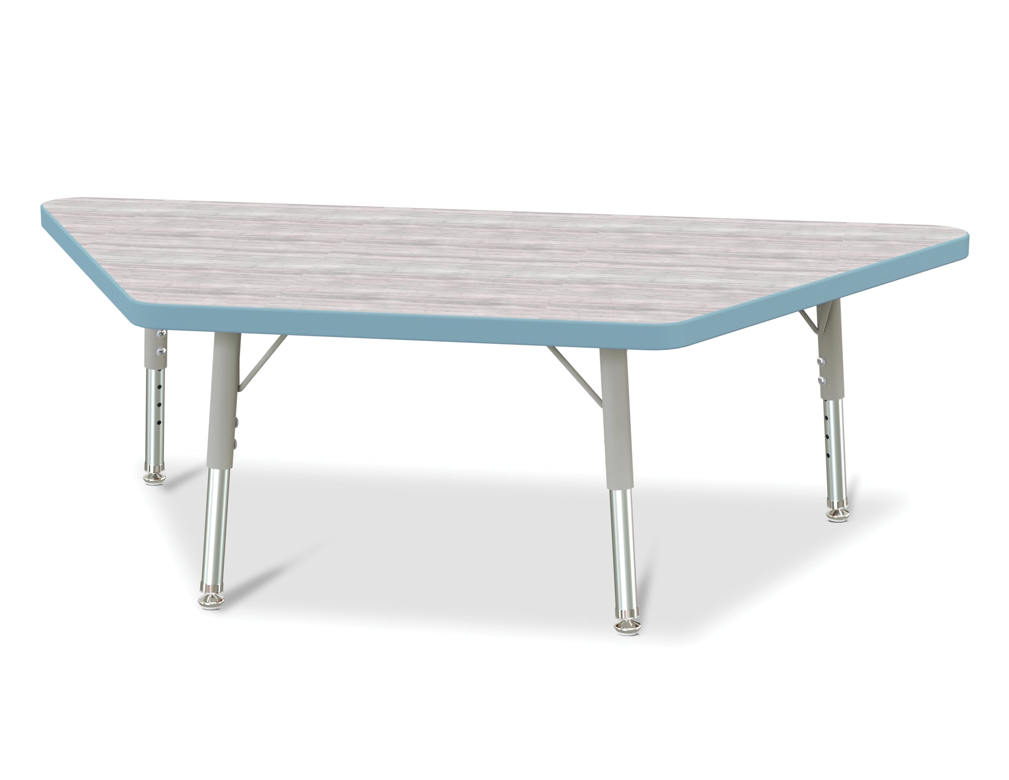 Great for students of any age, multiple trapezoid tables can be arranged in many configurations to accommodate any space. Accommodates up to 5 chairs. The legs feature glides that reduce noise, prevent snags, and resist rust. Driftwood Gray tabletop with Coastal Blue TRUEdge and Gray legs.