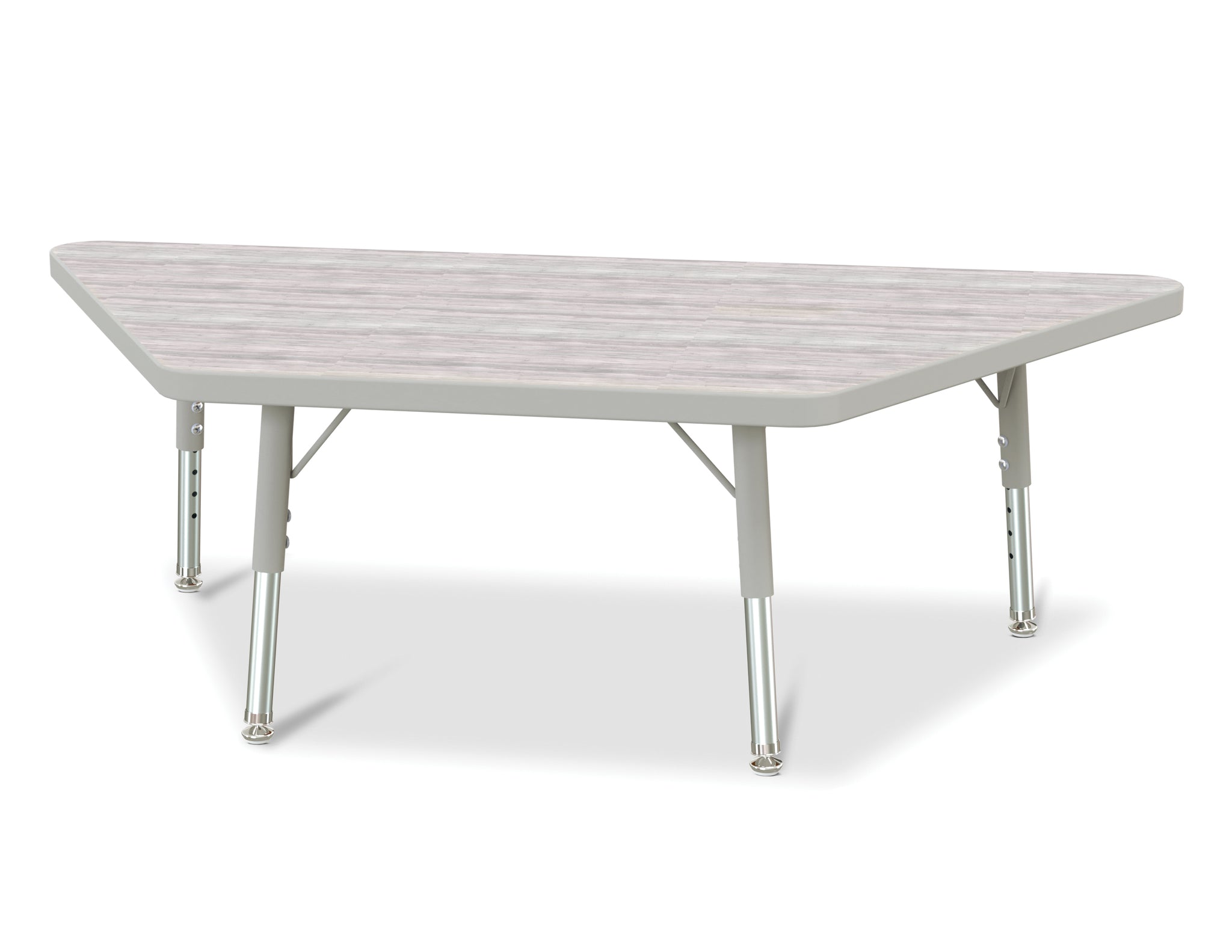 Great for students of any age, multiple trapezoid tables can be arranged in many configurations to accommodate any space. Accommodates up to 5 chairs. The legs feature glides that reduce noise, prevent snags, and resist rust. Driftwood Gray tabletop with Gray TRUEdge and Gray legs.
