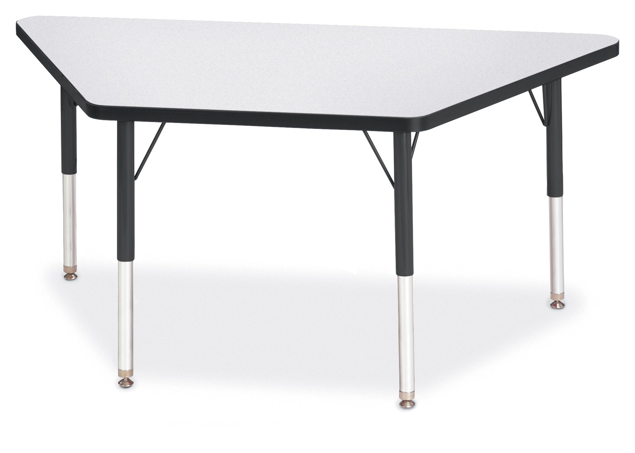 Great for students of any age, multiple trapezoid tables can be arranged in many configurations to accommodate any space. Accommodates up to 5 chairs. The legs feature glides that reduce noise, prevent snags, and resist rust. Freckled gray tabletop with black TRUEdge and black legs.