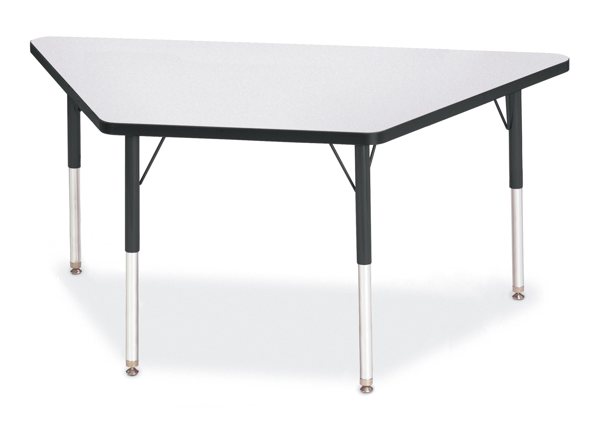 Great for students of any age, multiple trapezoid tables can be arranged in many configurations to accommodate any space. Accommodates up to 5 chairs. The legs feature glides that reduce noise, prevent snags, and resist rust. Freckled gray tabletop with black TRUEdge and black legs.