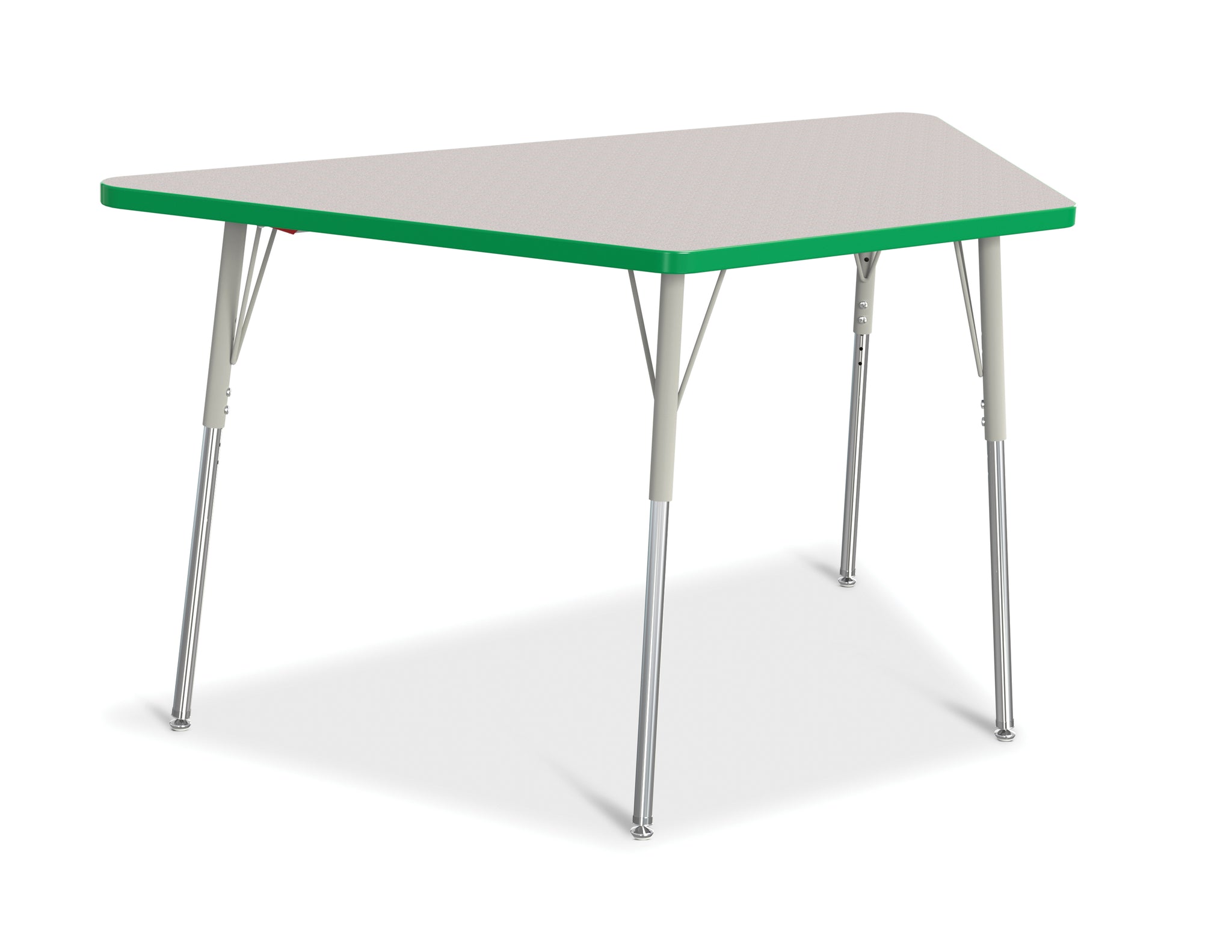 Great for students of any age, multiple trapezoid tables can be arranged in many configurations to accommodate any space. Accommodates up to 5 chairs. The legs feature glides that reduce noise, prevent snags, and resist rust. Freckled gray tabletop with green TRUEdge and gray legs.