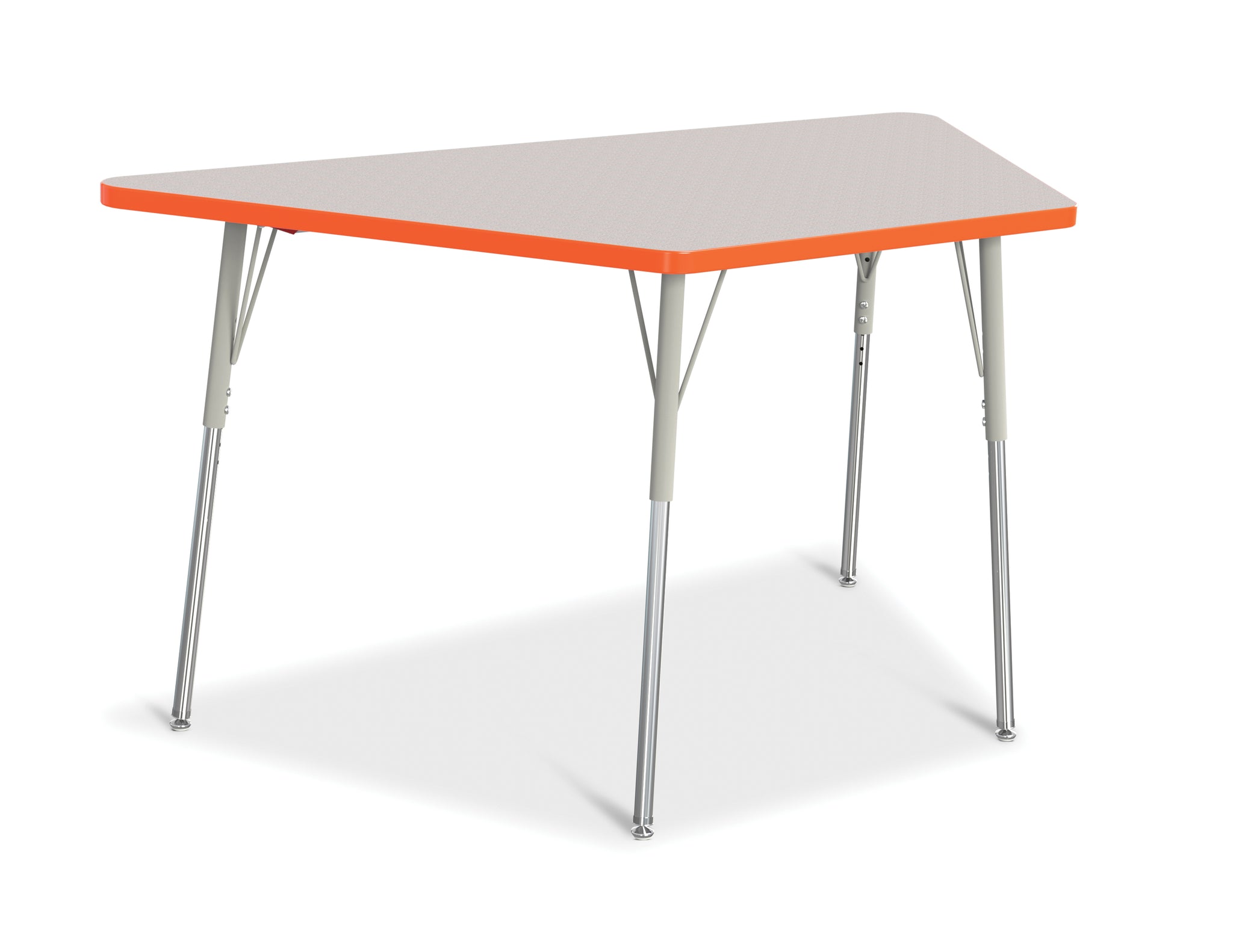 Great for students of any age, multiple trapezoid tables can be arranged in many configurations to accommodate any space. Accommodates up to 5 chairs. The legs feature glides that reduce noise, prevent snags, and resist rust. Freckled gray tabletop with orange TRUEdge and gray legs.