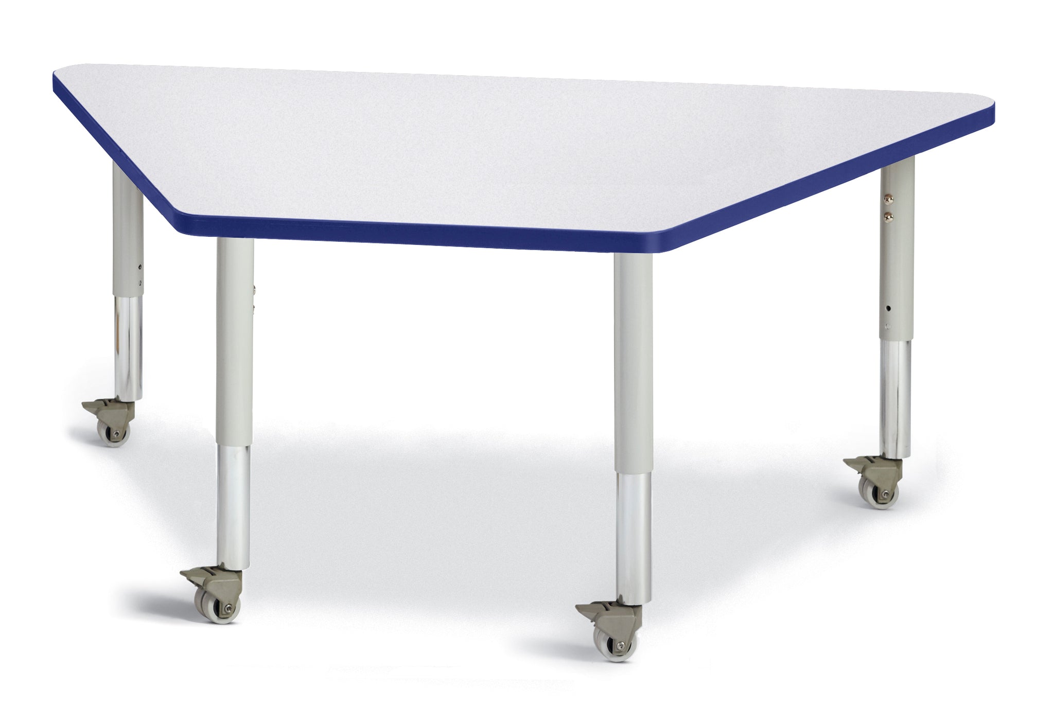Great for students of any age, multiple trapezoid tables can be arranged in many configurations to accommodate any space. Accommodates up to 5 chairs. The legs adjust from 20” to 31” high, are 2” thick, and feature heavy-duty casters. Freckled gray tabletop with blue TRUEdge, gray legs, and gray casters.