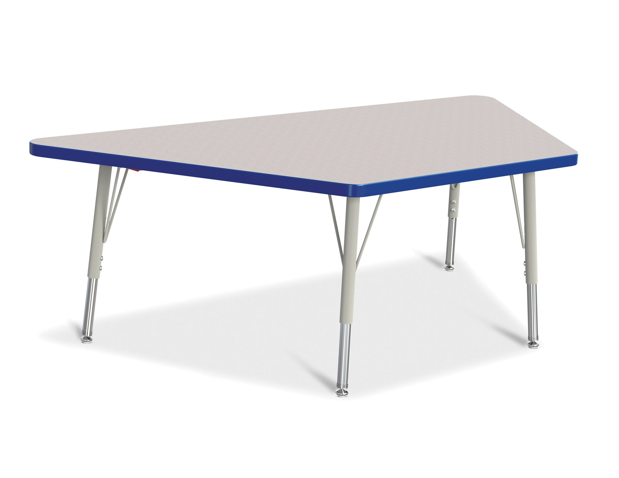 Great for students of any age, multiple trapezoid tables can be arranged in many configurations to accommodate any space. Accommodates up to 5 chairs. The legs adjust from 20” to 31” high, are 2” thick, and feature heavy-duty casters. Freckled gray tabletop with purple TRUEdge, gray legs, and gray casters.