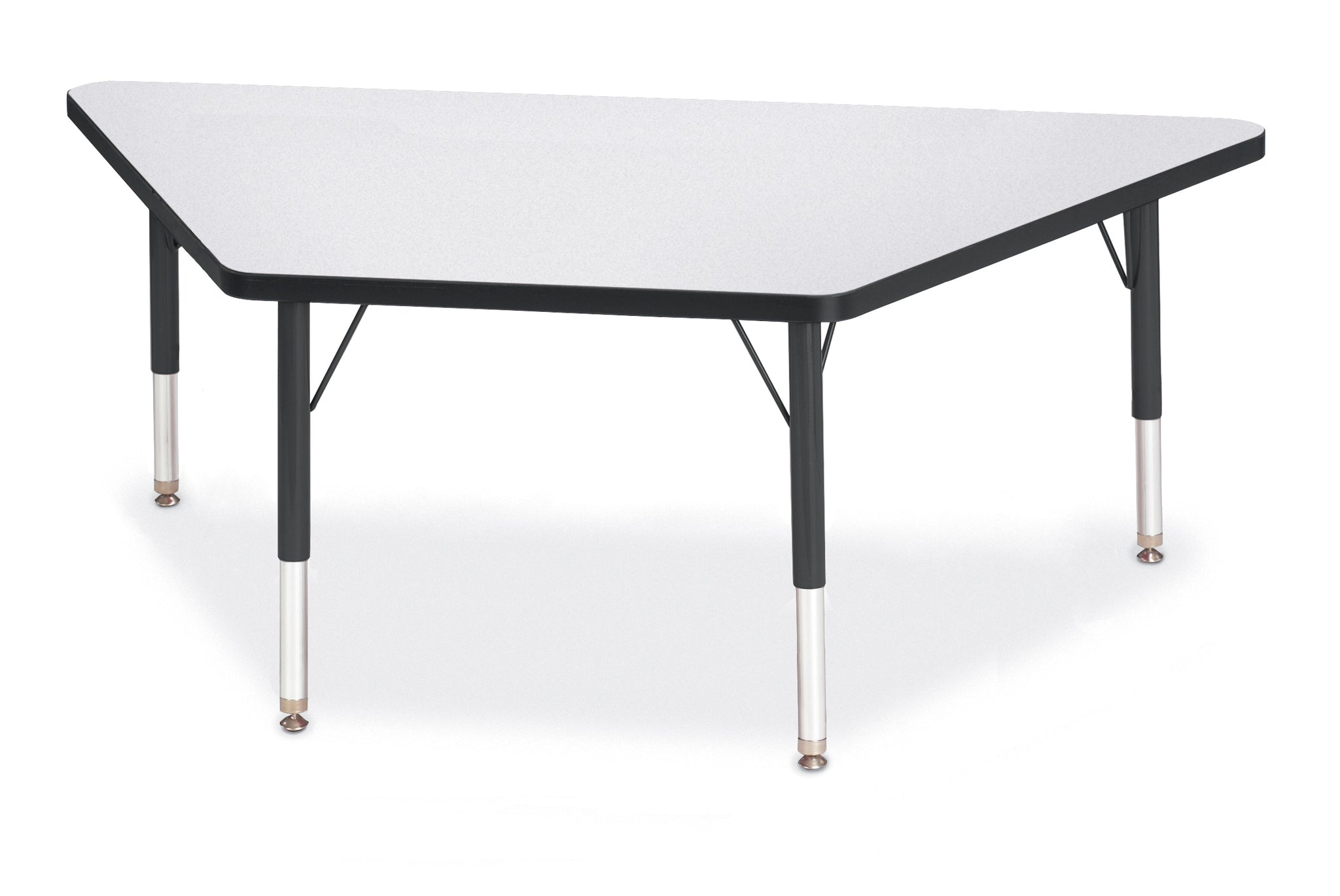 Great for students of any age, multiple trapezoid tables can be arranged in many configurations to accommodate any space. Accommodates up to 5 chairs. The legs feature glides that reduce noise, prevent snags, and resist rust. Freckled gray tabletop with black TRUEdge and black legs.