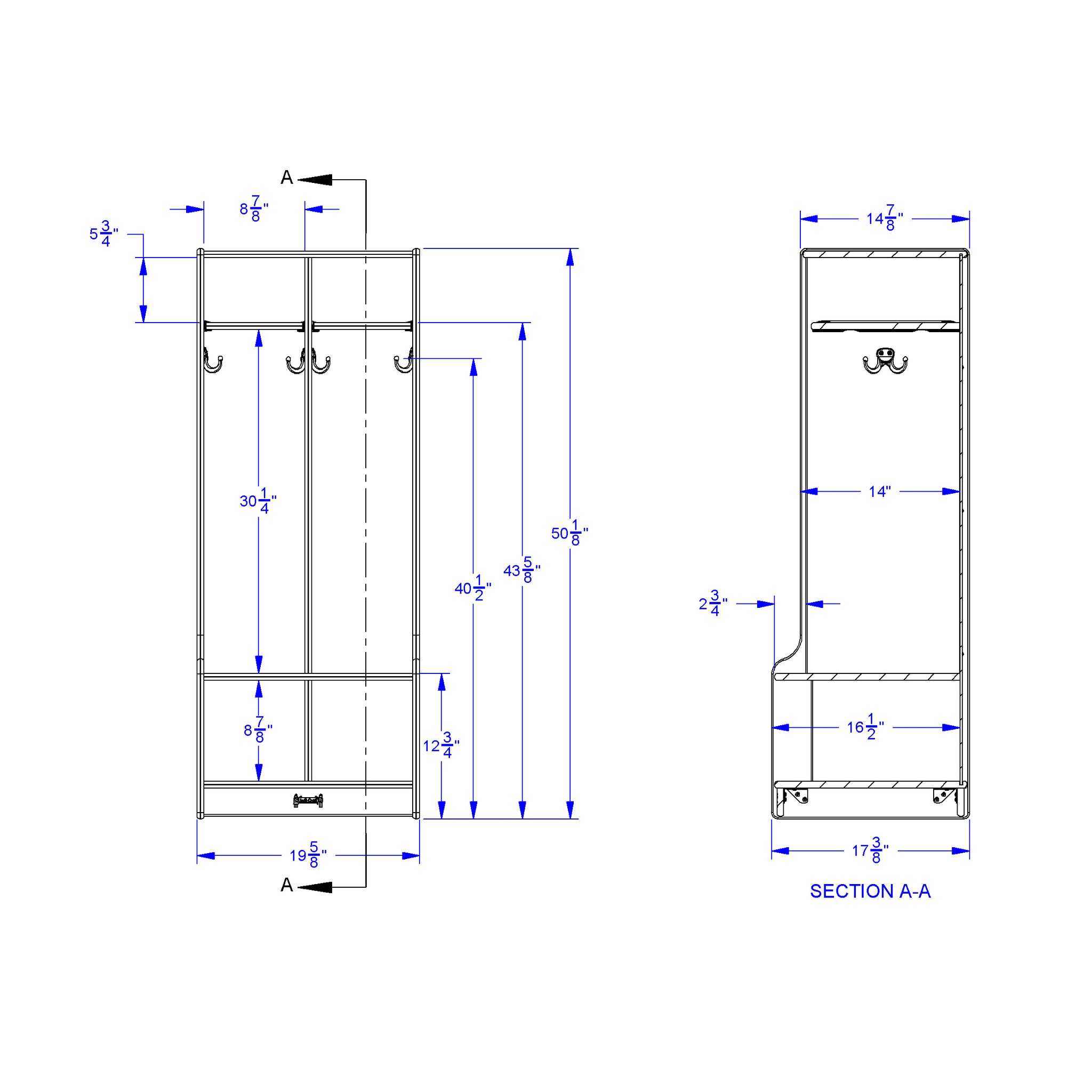 Two section locker with step for sitting. Four double coat hooks. Stationary.
