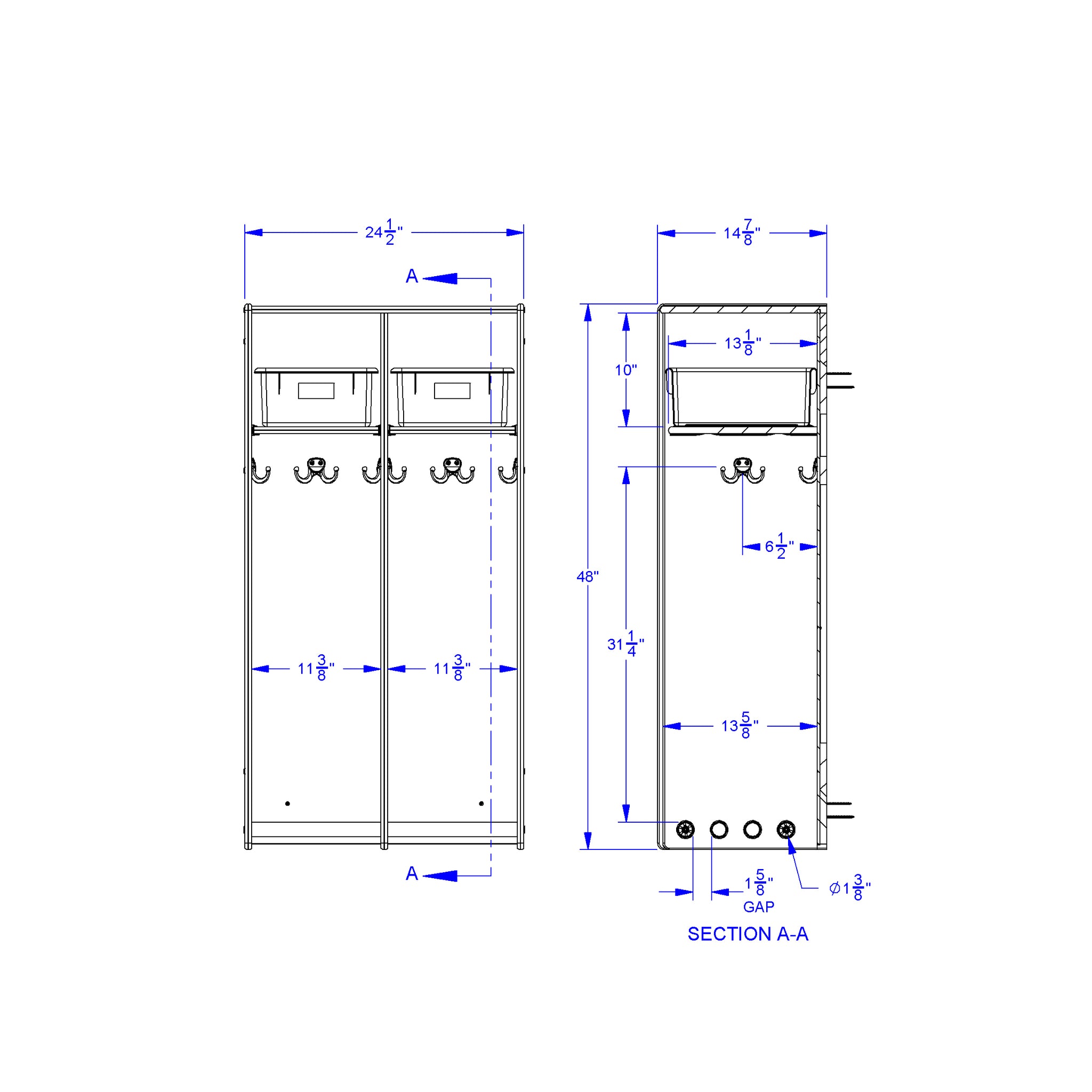 Keep coats, boots, shoes, and more off the floor and organized with this two section hanging locker. Each section features three double-hooks for hanging book bags and jackets and a space for storing lunch bags, papers, and hats. Four aluminum tubes at the bottom of each section allow water, snow, and dirt to fall to the floor or into a boot tray (not included) for easy cleanup. Platinum Tubs provide ample storage for children’s outerwear, papers, and take home items. Each section is 11-3/8” wide. Wall mount brackets included.