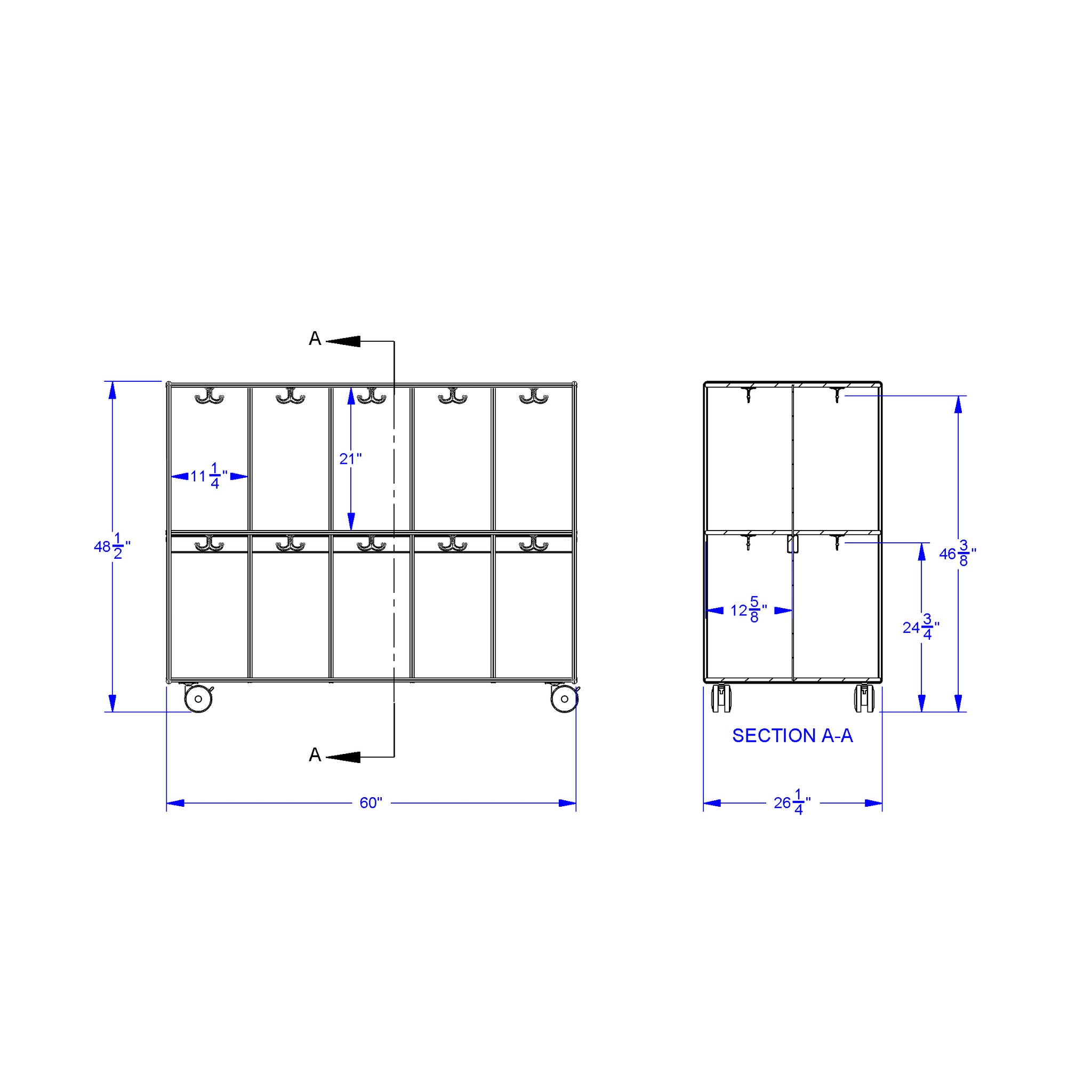 This two-sided, mobile locker unit is ideal for backpack storage. Each side has 10 sections (20 in total). Each individual section is 11” wide x 13” deep x 21” high and contains a top-mounted, double coat hook. The 4" locking casters allow the mobile backpack cubbie to glide in and out of the classroom.