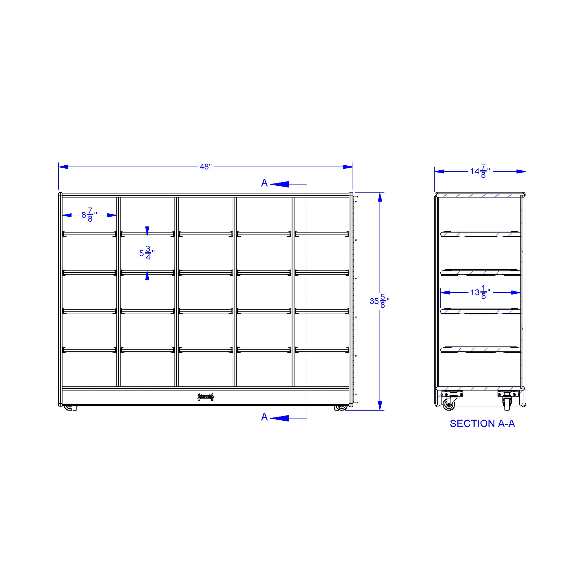 Generous storage at a child's height. Twenty-five clear Cubbie-Trays on one side, and eight open storage sections on the other side. Secure the hasp when needed. Each section is 48" wide x 15" deep x 35.5" high. Opens to eight feet.