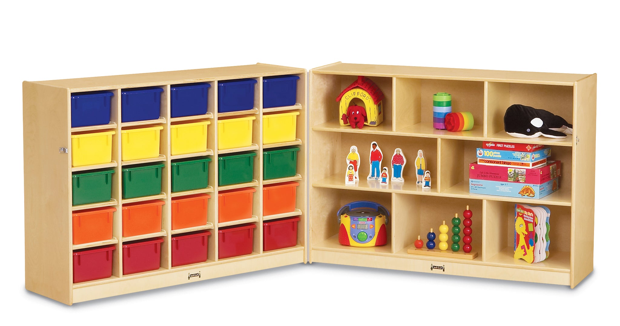 Generous storage at a child's height. Twenty-five colored Cubbie-Trays on one side, and eight open storage sections on the other side. Secure the hasp when needed. Each section is 48" wide x 15" deep x 35.5" high. Opens to eight feet.