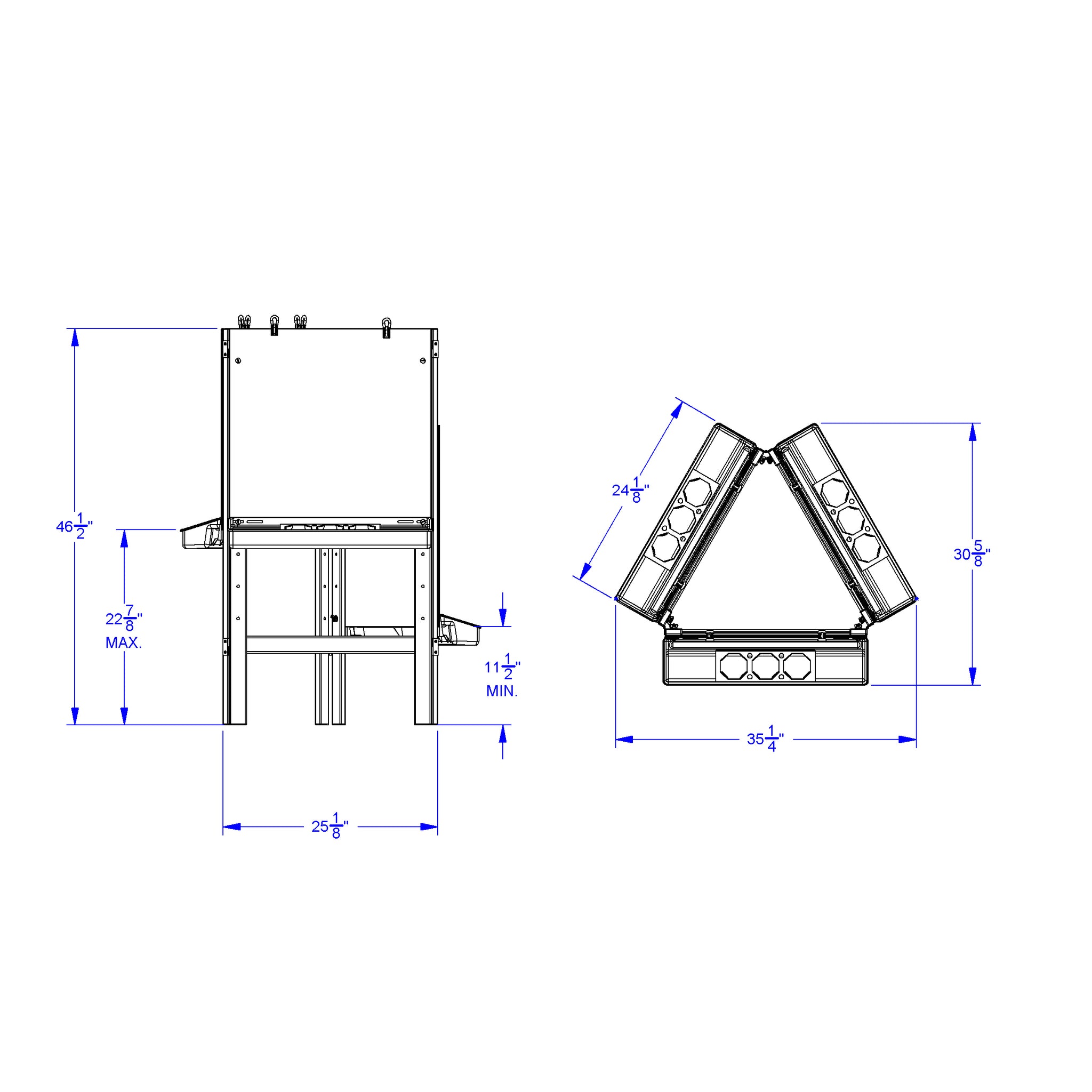 Give each artist lots of elbow room at this triple easel. Each side is adjustable to accommodate different heights from 36" to 46.5". Comes standard with hardboard easels. Optional Acrylic, Chalkboard and Write-n-Wipe panel available. Clips and paint trays are included. Maple frame is 46.5" high, work panels are 24" wide x 24" high.