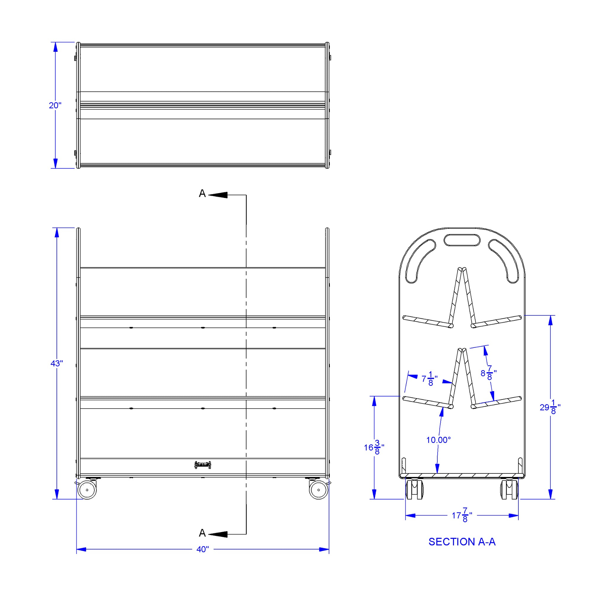 This book truck will make transporting books an easy task. It features ergonomic handle cutouts at each end and two, double-sided sloped shelves to keep books in place during transport. The additional storage area on the bottom is captured by raised edges and is great for miscellaneous or odd sized items.