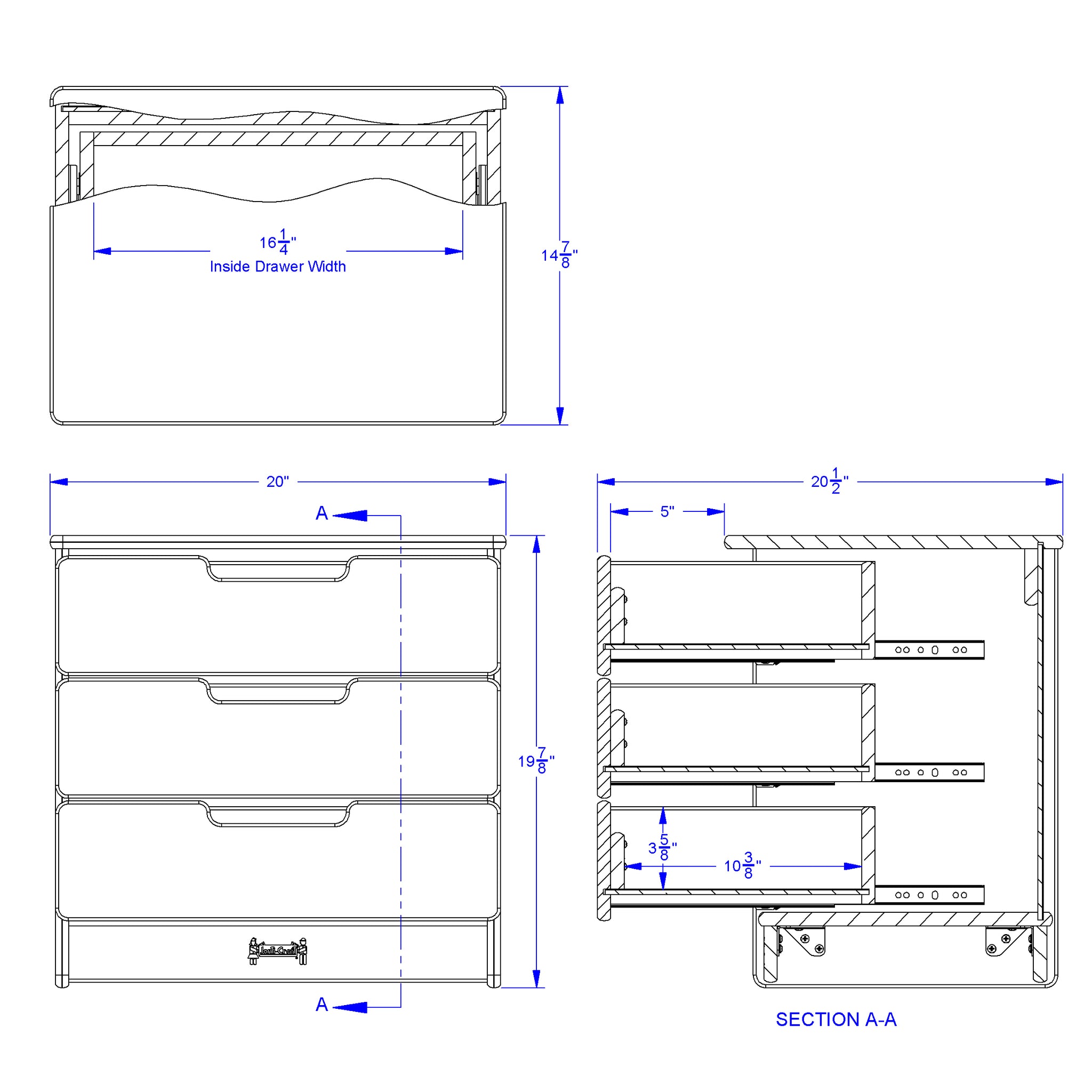 Three drawers, featuring “cut out" handles, operate smoothly on metal gliders with built-in stops.