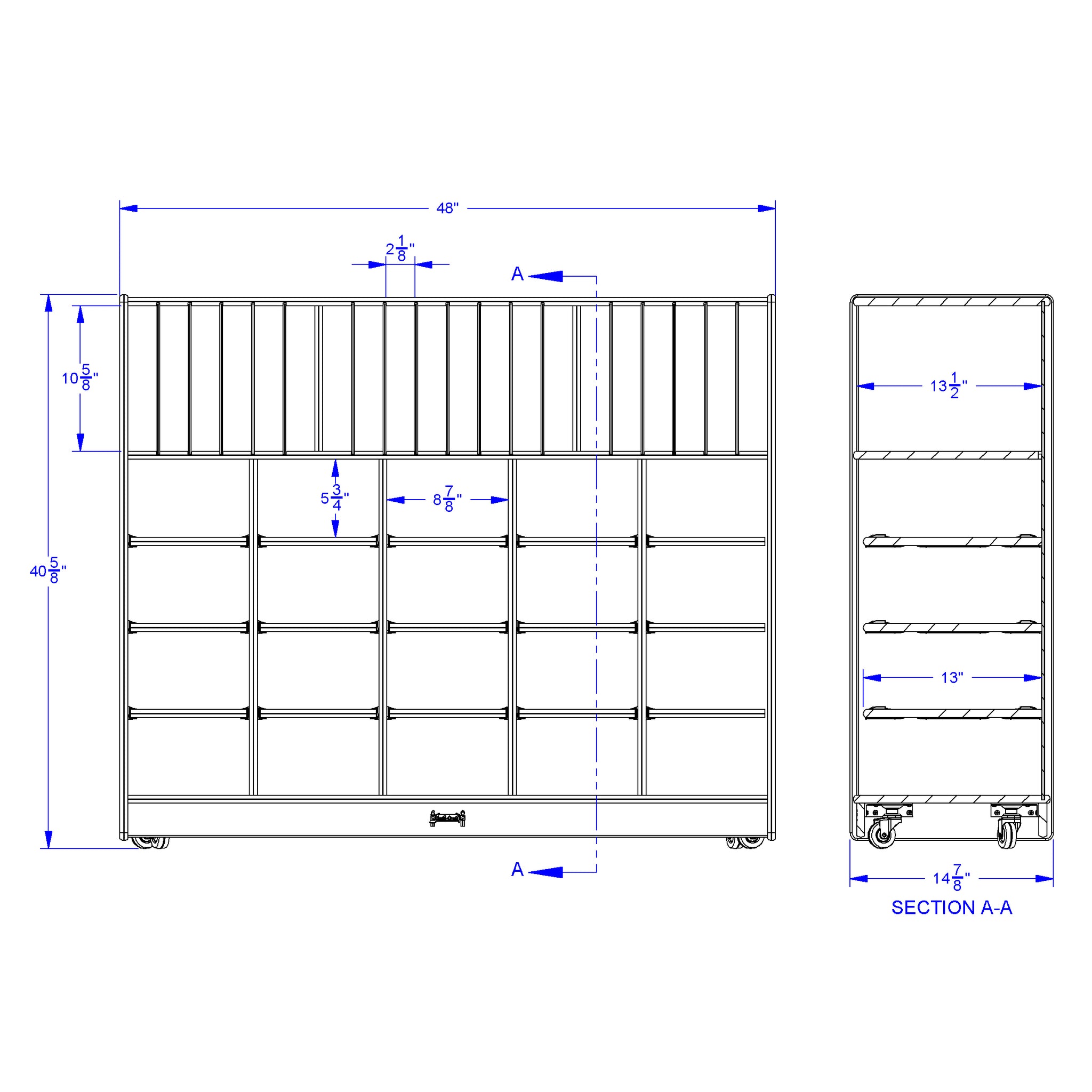 Removable folder partitions and cubbie-tray openings for twenty students. Cubbie-Trays not included.