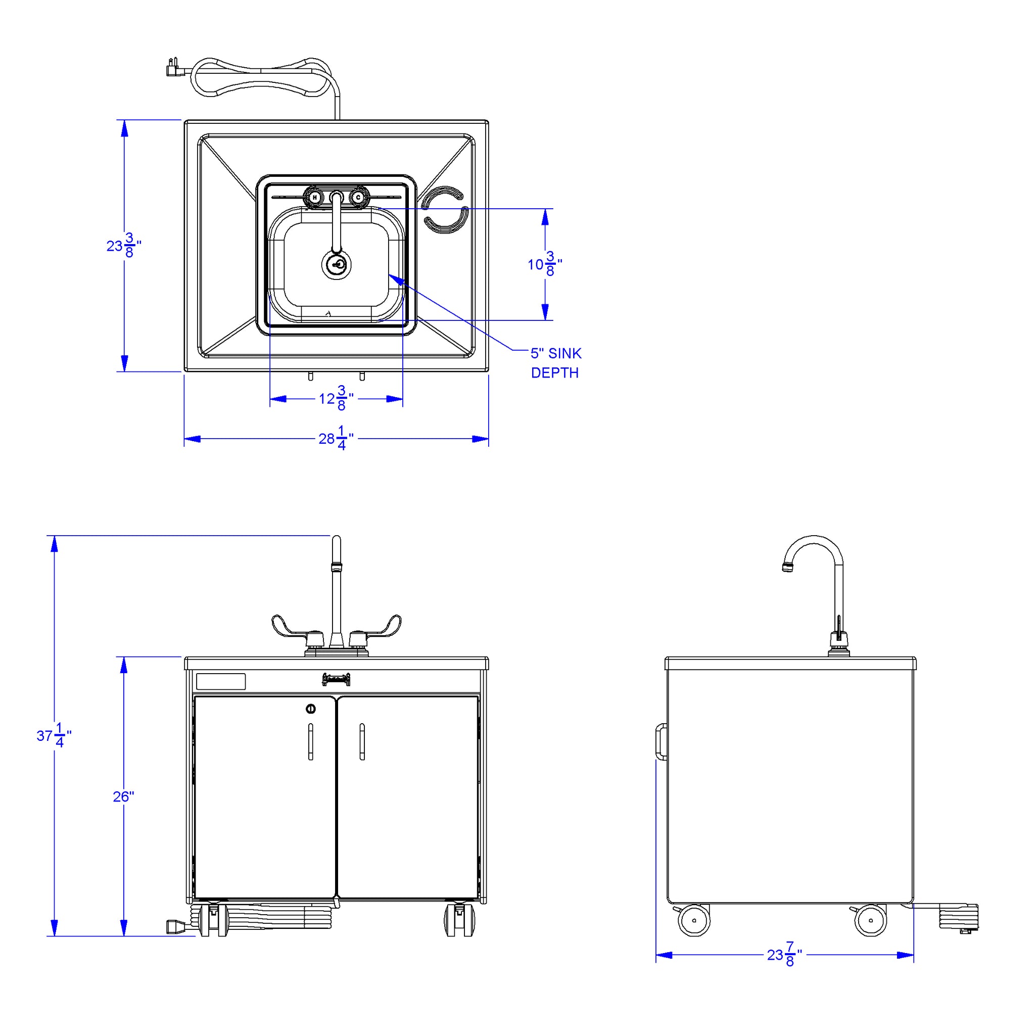 A portable hand washing station without plumbing at just the right height for young ones! Encourage hand washing habits and help keep everyone healthy while meeting licensing requirements. Water is heated by the tankless, on-demand water heater. The water pump has a flow rate of .35 gallons per minute and the faucet features a water-saving aerator. The tank for the non-potable clean water holds five gallons while the waste water tank holds six gallons. There is a catch tray under the tanks. Mistake-proof connectors means the clean and waste water tanks cannot be inadvertently switched. Stainless Steel sink is approximately 5" deep. Based on washing hands for about 20 seconds, each tank provides 40-50 handwashes. Power switch inside the cabinet and openings for cord management. Mobile tank cart and filler hose with funnel available separately in Accessories Kit. ONLY AVAILABLE IN UNITED STATES.