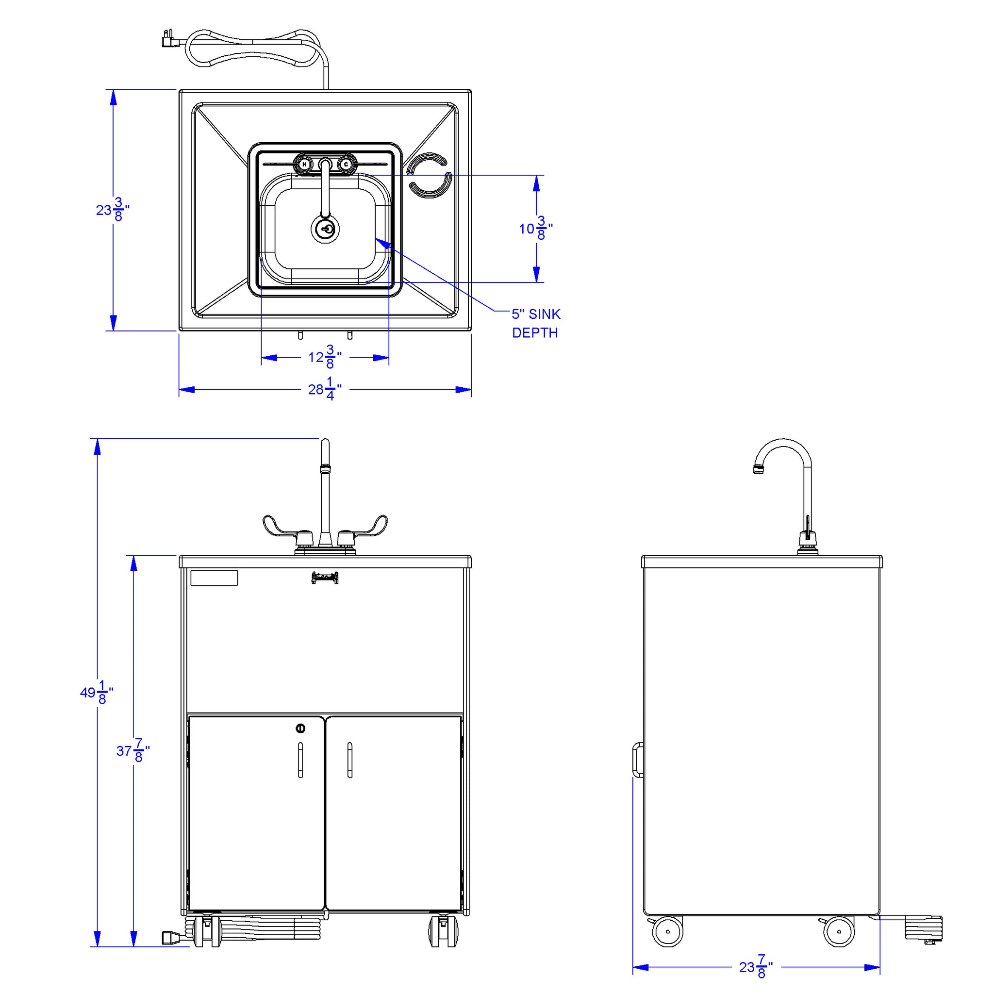 Set up a portable hand washing station without plumbing! Encourage hand washing habits and help keep everyone healthy while meeting licensing requirements. The 38" counter height is perfect for adults or older children with the help of a Step-Up Stool. Water is heated by the tankless, on-demand water heater. The water pump has a flow rate of .35 gallons per minute and the faucet features a water-saving aerator. The tank for the non-potable clean water holds five gallons while the waste water tank holds six gallons. There is a catch tray under the tanks. Mistake-proof connectors means the clean and waste water tanks cannot be inadvertently switched. Stainless Steel sink is approximately 5" deep. Based on washing hands for about 20 seconds, each tank provides 40-50 handwashes. Power switch inside the cabinet and openings for cord management. Mobile tank cart and filler hose with funnel available separately in Accessories Kit. ONLY AVAILABLE IN UNITED STATES.