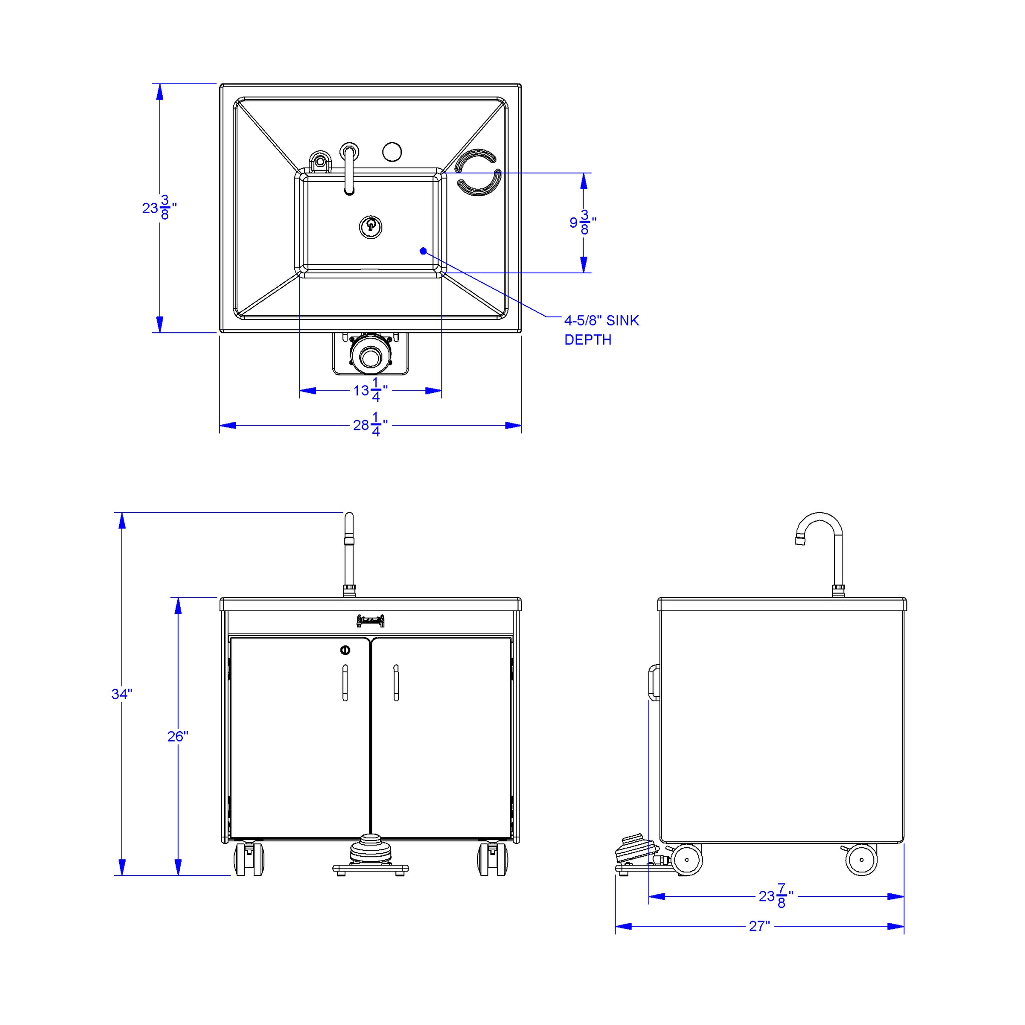 Our popular portable sink at just the right height for kids – except no electricity required! Encourage hand washing habits and help keep everyone healthy while meeting licensing requirements. The 26" counter height is perfect for children. The foot-operated water pump delivers 2.8 ounces of water per stroke and has a flow rate of up to 1.3 gallons per minute. The tank for the non-potable clean water holds five gallons while the waste water tank holds six gallons. There is a catch tray under the tanks. Mistake-proof connectors means the clean and waste water tanks cannot be inadvertently switched. Plastic sink is approximately 5" deep. Foot pump can be placed inside the cabinet when sink is not being used or when moving the sink. Mobile tank cart and filler hose with funnel available separately in Accessories Kit.