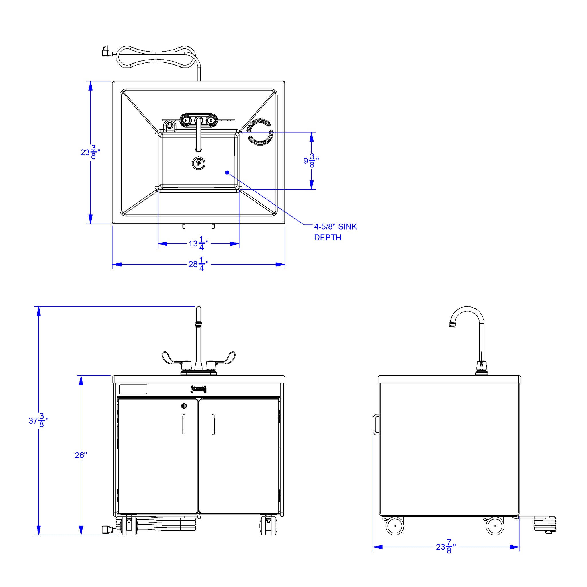 Set up a portable hand washing station without plumbing! Encourage hand washing habits and help keep everyone healthy while meeting licensing requirements. The 26" counter height is perfect for children. The water pump has a flow rate of up to half a gallon per minute. The tank for the non-potable clean water holds five gallons while the waste water tank holds six gallons. There is a catch tray under the tanks. Mistake-proof connectors means the clean and waste water tanks cannot be inadvertently switched. Plastic sink is approximately 5" deep. Power switch inside the cabinet and openings for cord management. Based on washing hands for about 20 seconds, each tank provides 40-50 handwashes. Mobile tank cart and filler hose with funnel available separately in Accessories Kit. ONLY AVAILABLE IN UNITED STATES. *Does not have hot water.