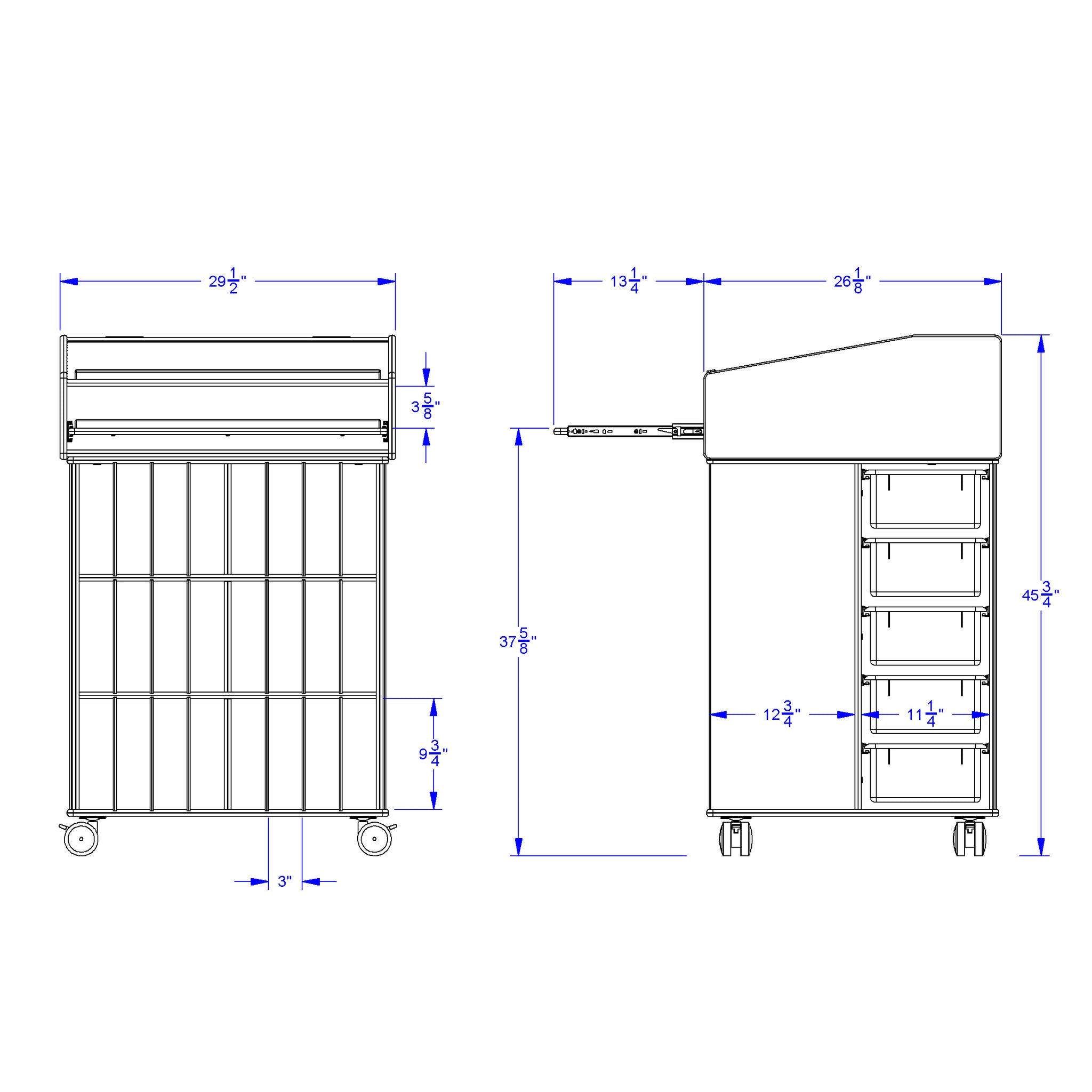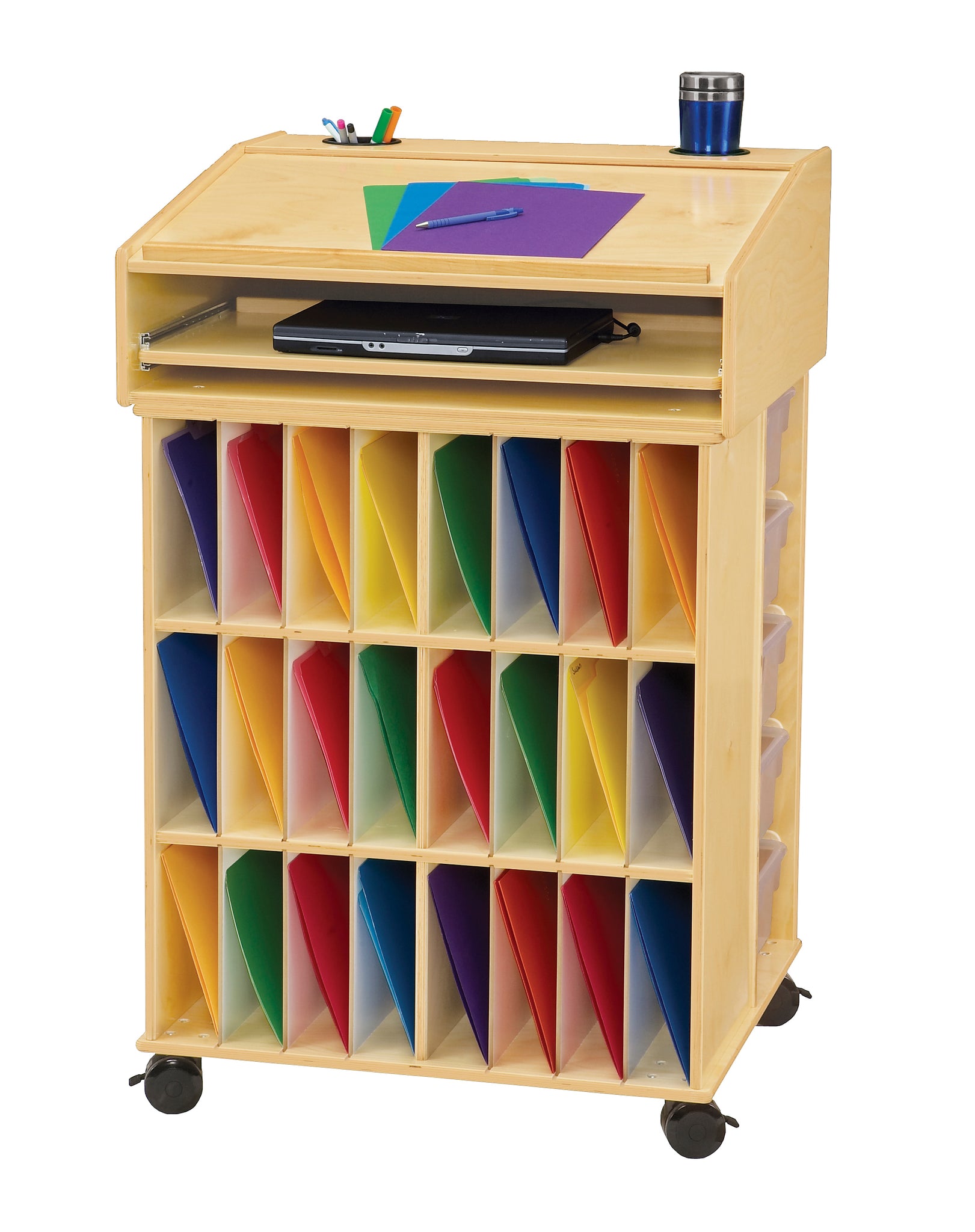 Process check-in, manage messages, mail, and homework with this communication center. Pull-out drawer, 37 1/2" high, is ideal for laptop. Write-n-Wipe front is perfect for postings or displaying projects. Slanted top works well as a writing surface or for reading while speaking. Two oversized cup holders, eighteen removable mail partitions and ten clear tubs included. Locking casters.