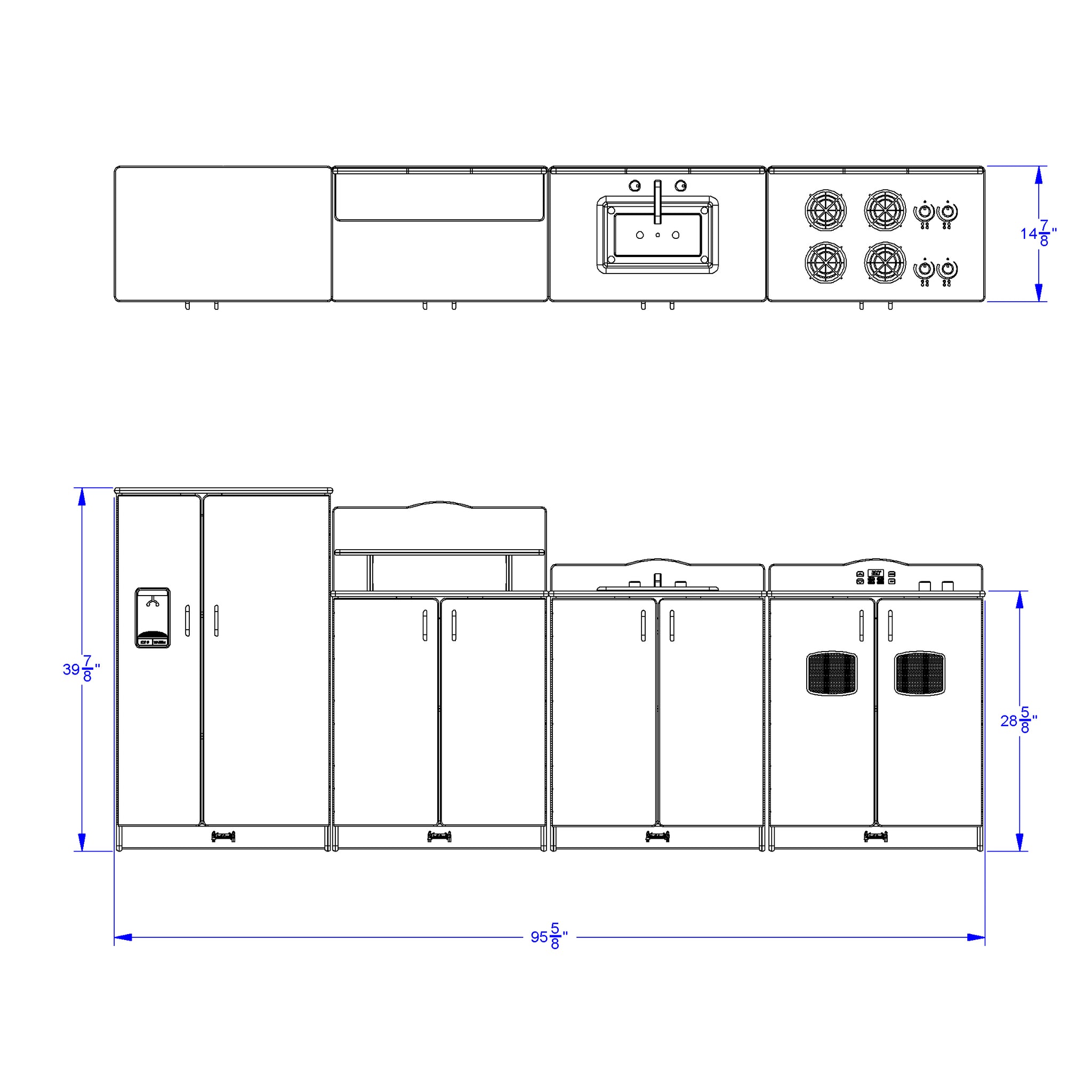 Sized just for elementary-aged children and after school programs, this kitchen provides realistic play with wooden turn-button controls, “ice-maker”, and four stove “burners”. Magnetic catches help keep doors closed while chrome-looking handles and faucet provide a high-end aesthetic. Counter is 28.5" high.