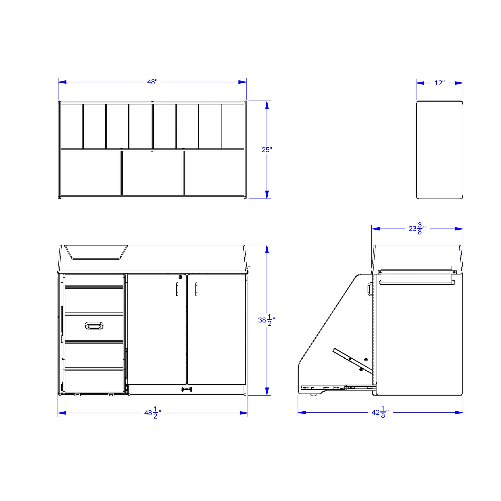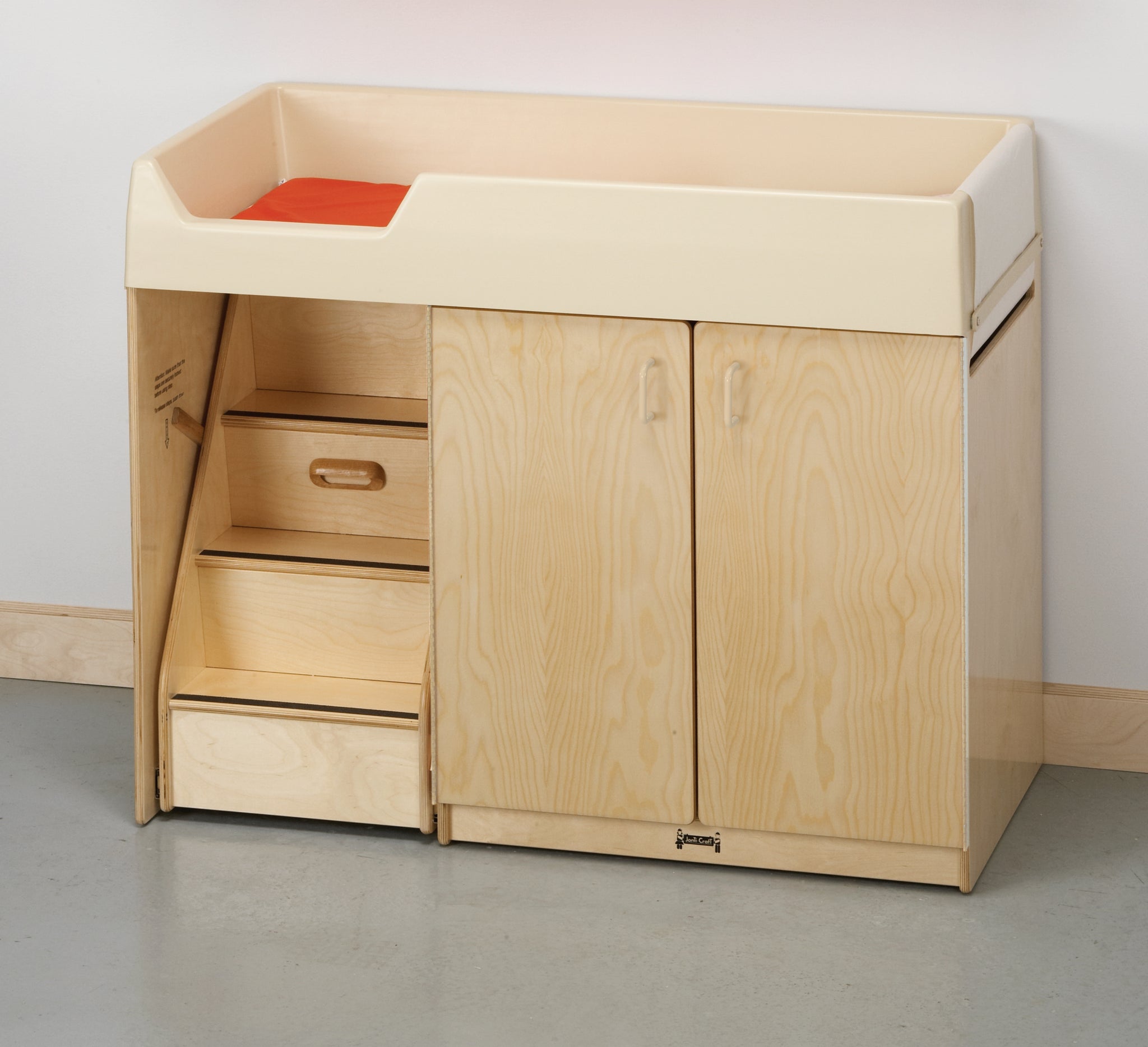 Create the perfect diapering area with this changing table and wall mounted storage shelf combo. The Diaper Changer features a plastic top for rigorous and easy cleaning. The lockable, glide-out stairs with safety treads are located on the left side of the unit and extra deep rails exceed recommended safety standards. The pull-out paper dispenser (paper not included) is easy to refill and keeps paper at hand. The included, 11 clear Cubbie-Trays are secured behind doors for safety. Changing pad is included. The Diaper Organizer provides convenient wall mounted storage for diapering necessities. Mounting hardware included.