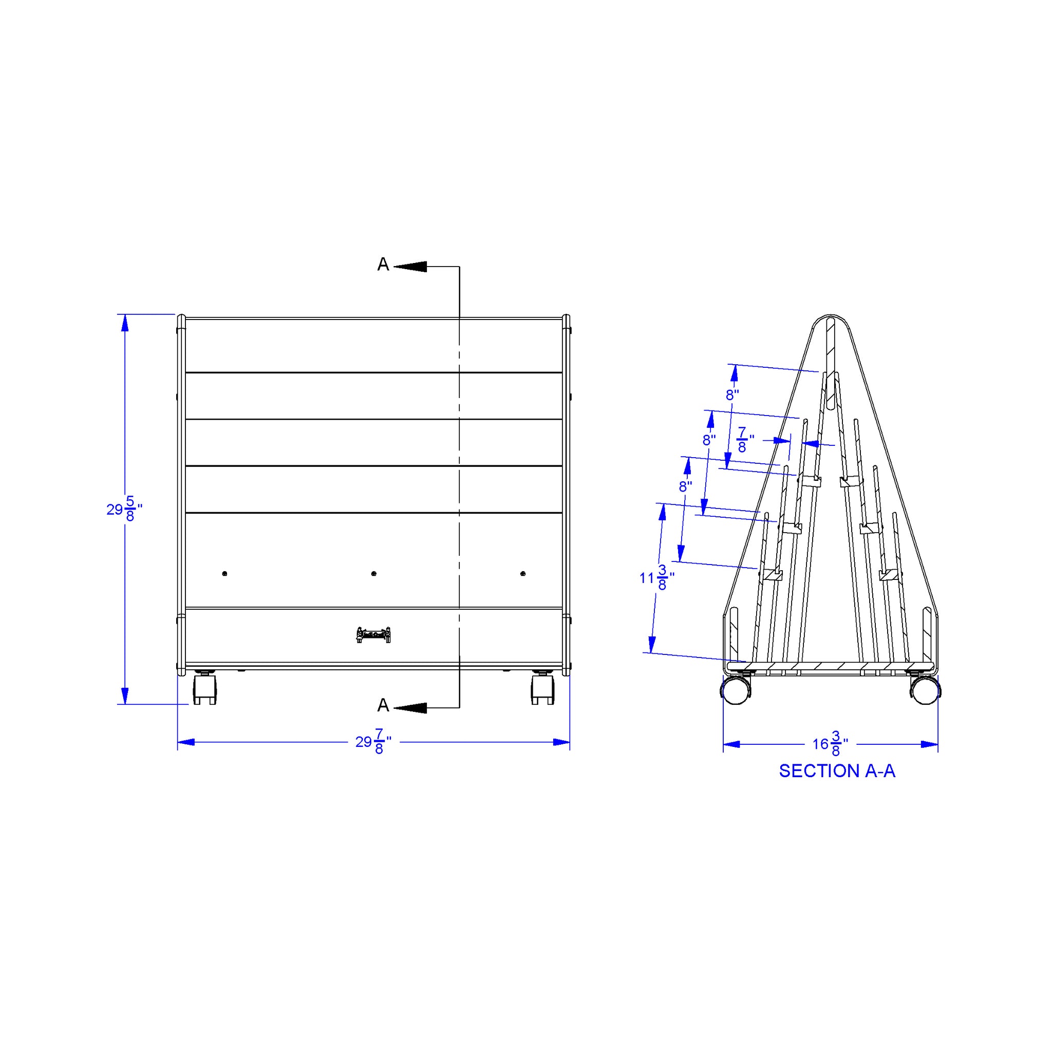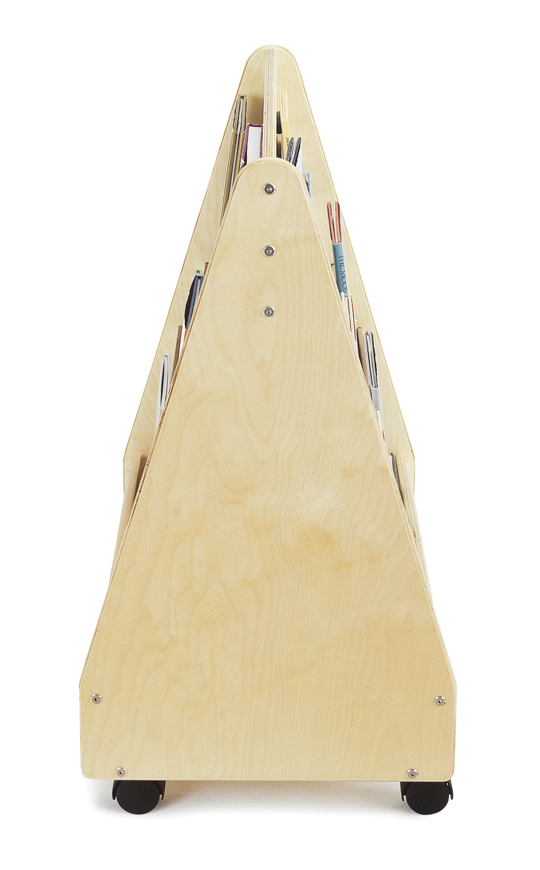 Our popular twin-sided Pick-a-Book Stand now on casters. Back is identical to front with equal storage capacity. Eight shelves total, approximately 1" deep. Minimal assembly.