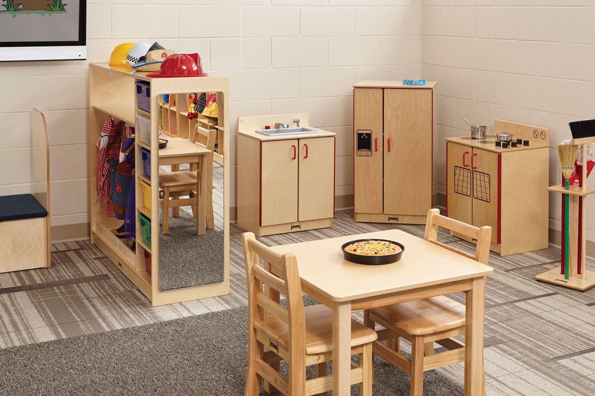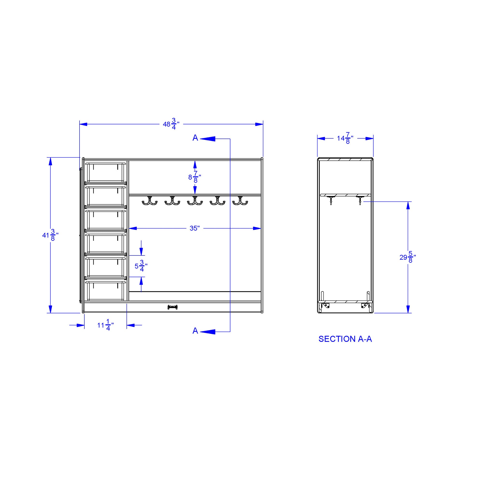 Organize any dress-up area and maximize your space. This dress-up storage unit features five double coat hooks for hanging costumes and the six colored Tubs are perfect for storing smaller accessories. Kids can display their favorite hats on the top shelf while storing shoes, boots, and larger items in the contained bottom shelf. With the attached acrylic mirror, children can see all of their costume creations!