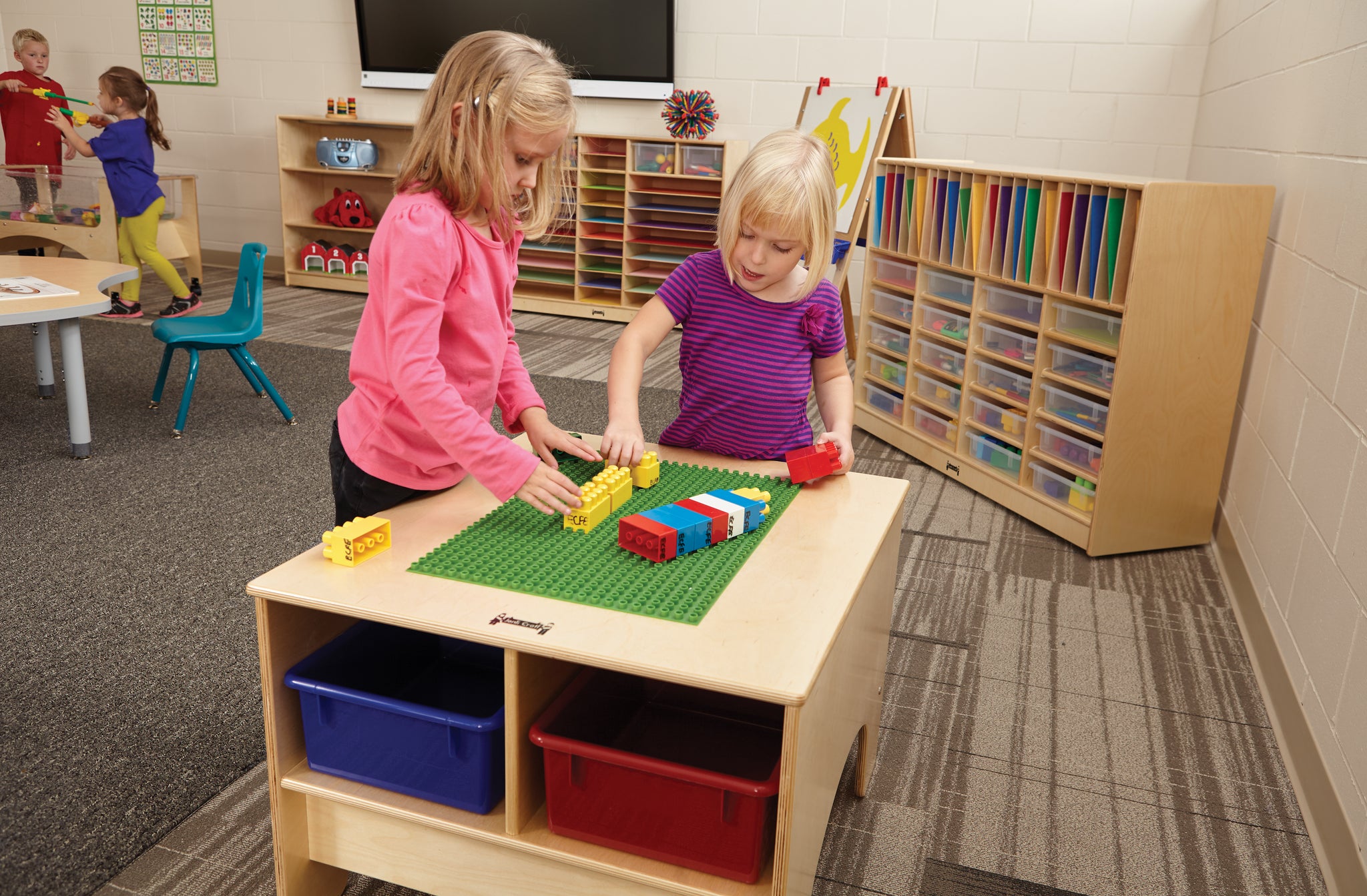 Table size is large enough to accommodate several children but small enough to fit in activity area. One base plate is permanently mounted to tabletop, colors will vary. Traditional Brick compatible base plates. Tubs not included.