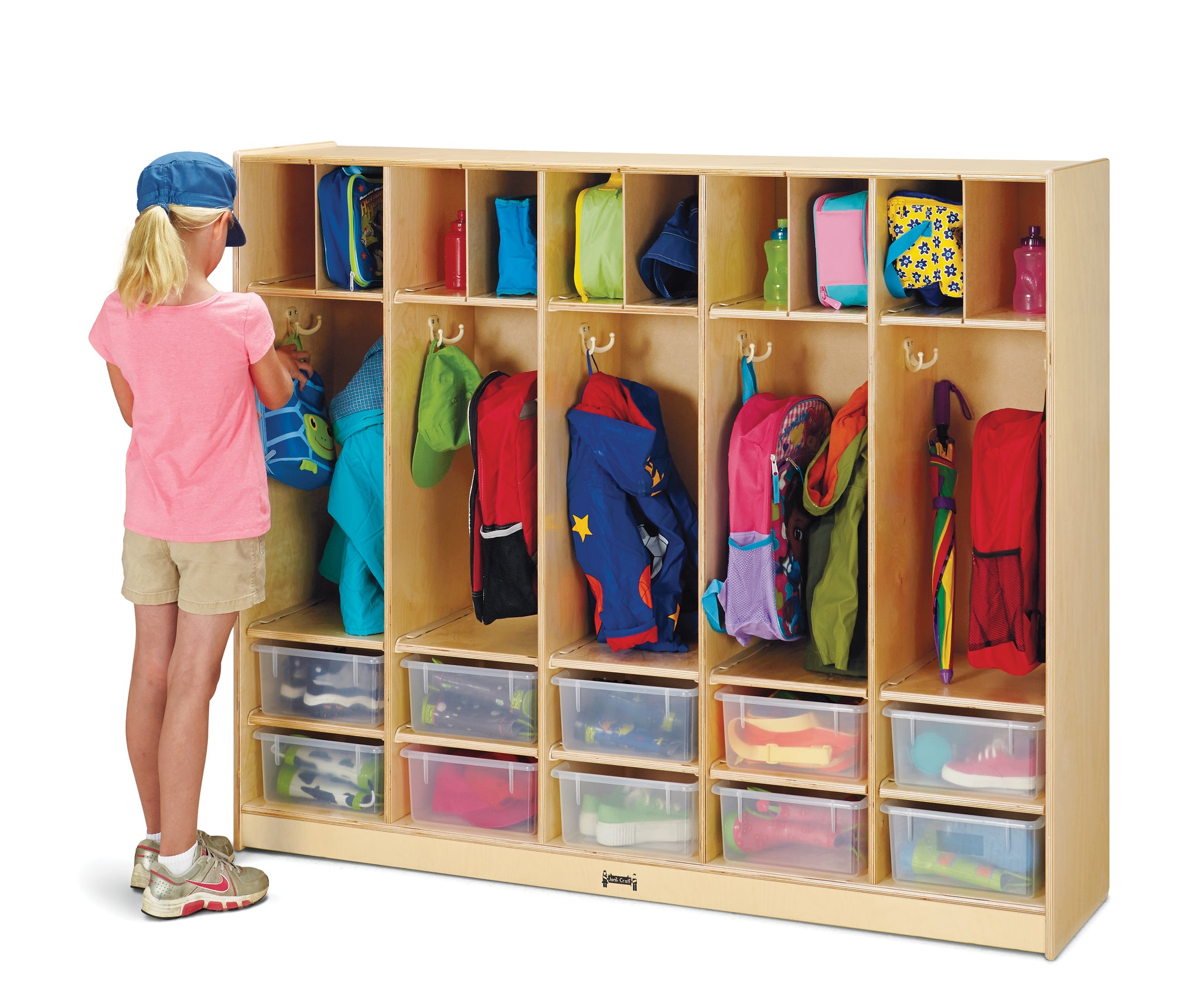 Maximize storage in your entry! Two-double coat hooks in each locker space are perfect for hanging coats, jackets, and bookbags. Two generous Cubbie-Trays below each locker neatly store shoes, mittens, and more. Ten total mail slots above the locker area are perfect for message and homework management.