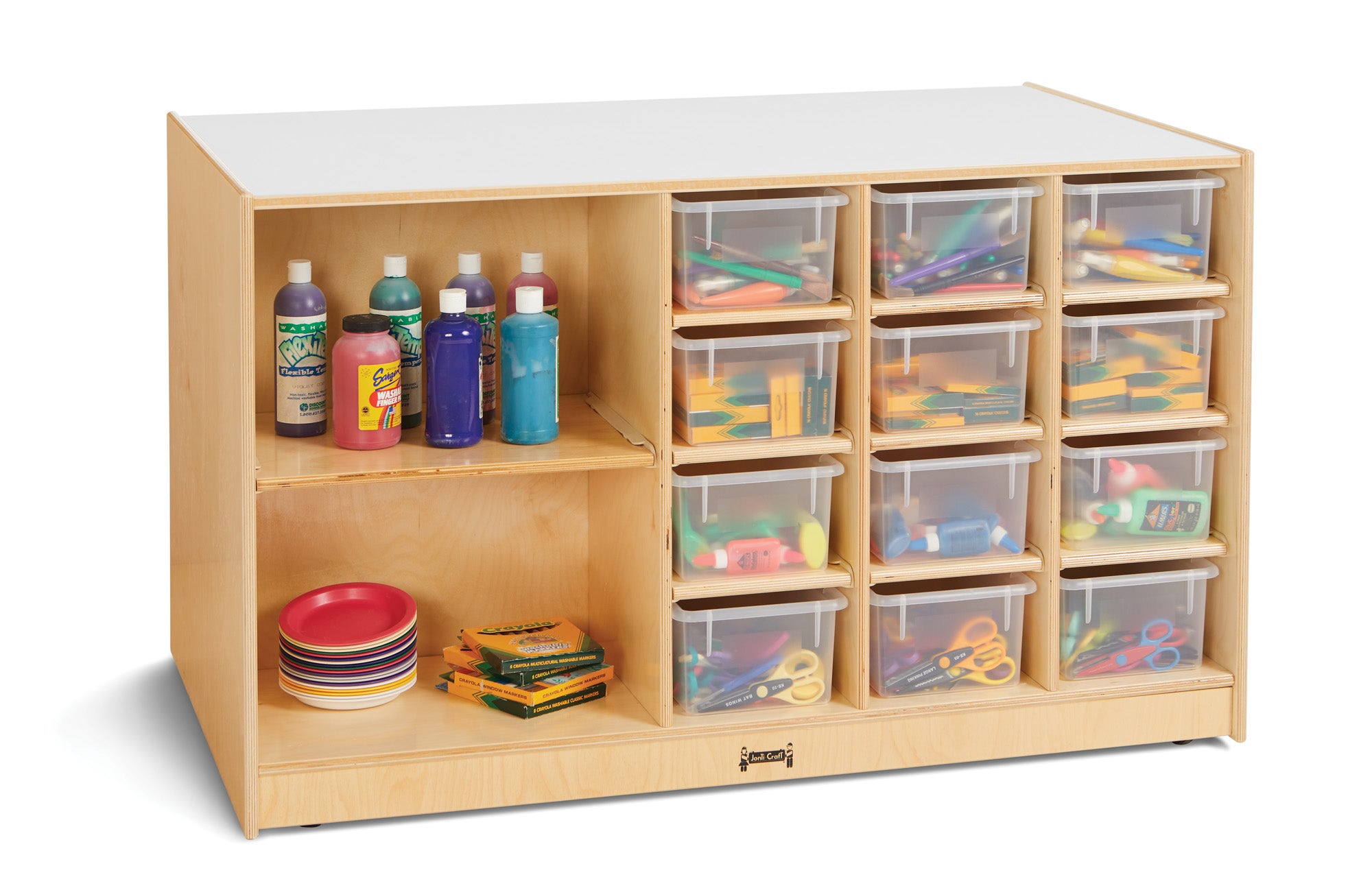 This mobile island provides double-sided storage and a worktop all in one. One side features three roomy shelves. The other side features two shelves and twelve clear Cubbie-Trays.