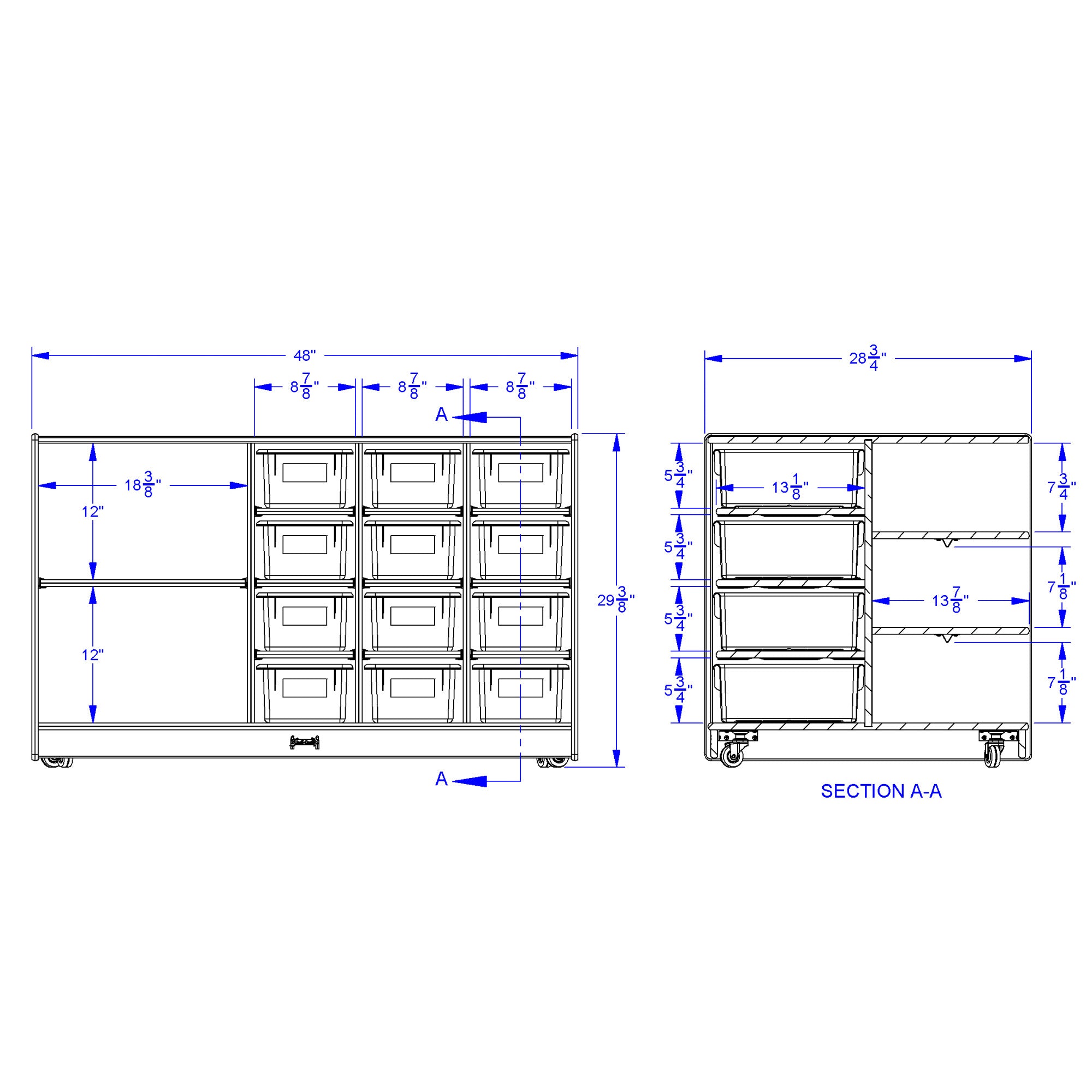 This mobile island provides double-sided storage and a worktop all in one. One side features three roomy shelves. The other side features two shelves and twelve colored Cubbie-trays.