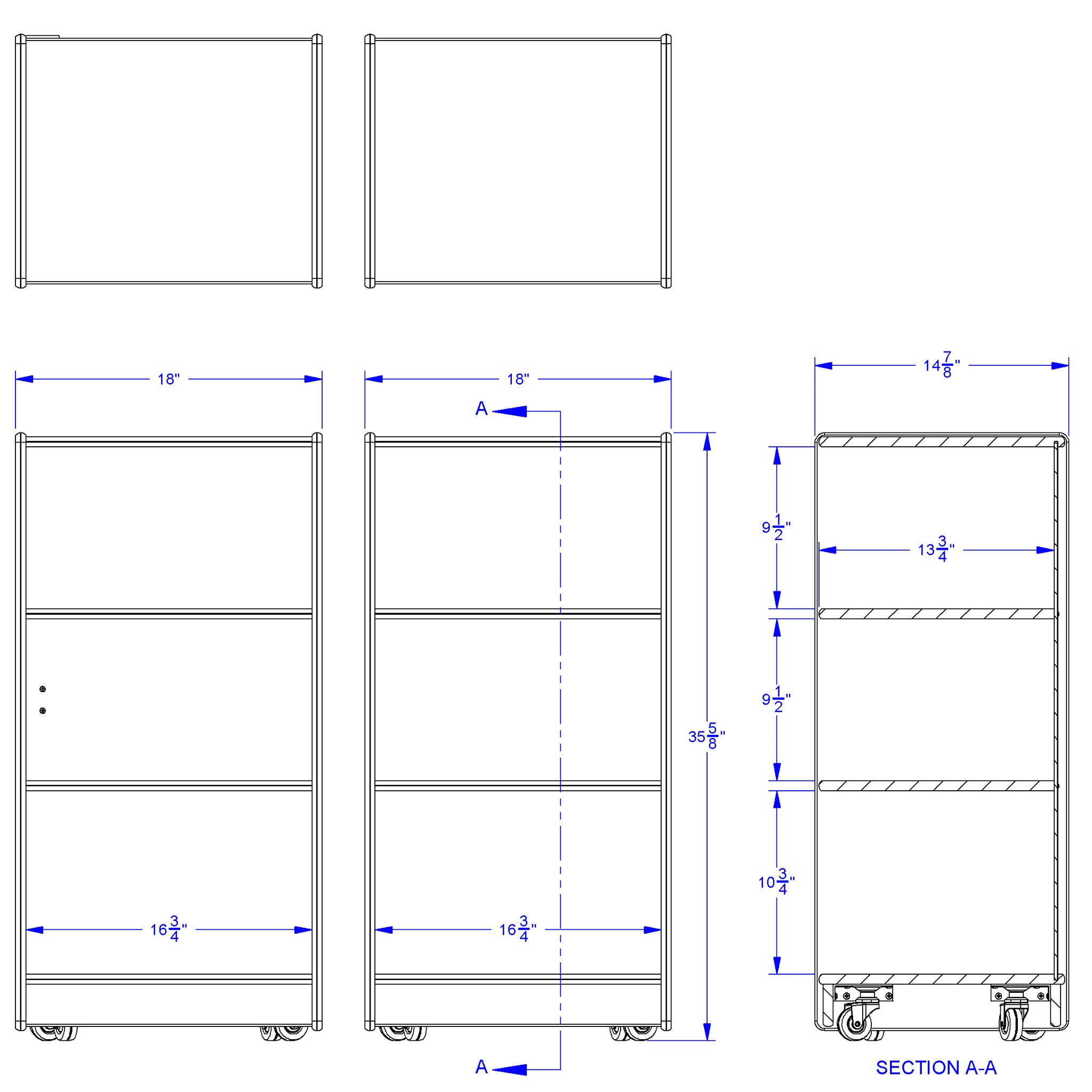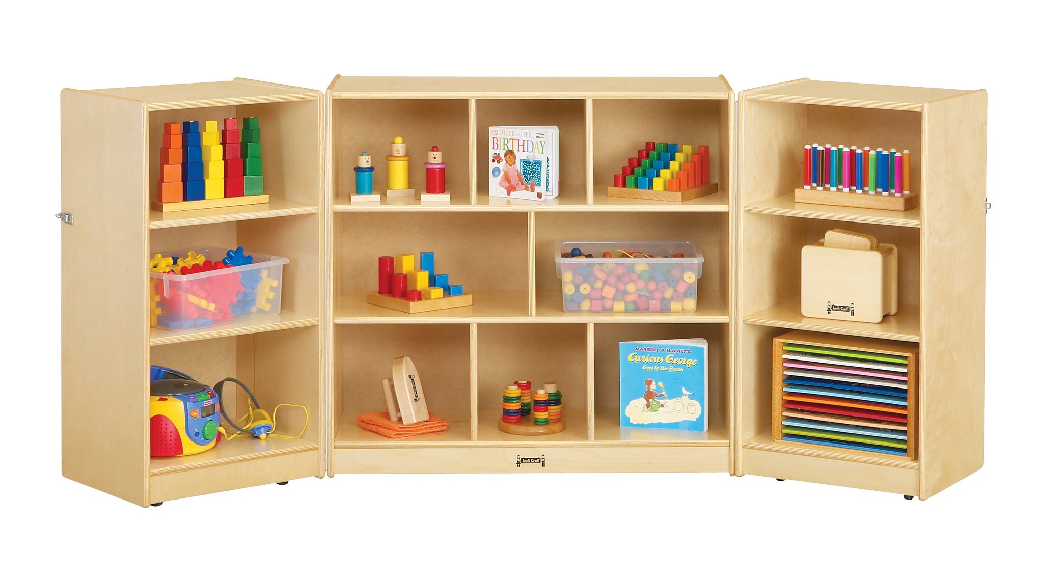 Designed for multiple use rooms where secured storage is needed. Center is 36.5" wide x 15" deep x 35.5" high. Each wing is 18" wide. Opens to 6.5 feet.