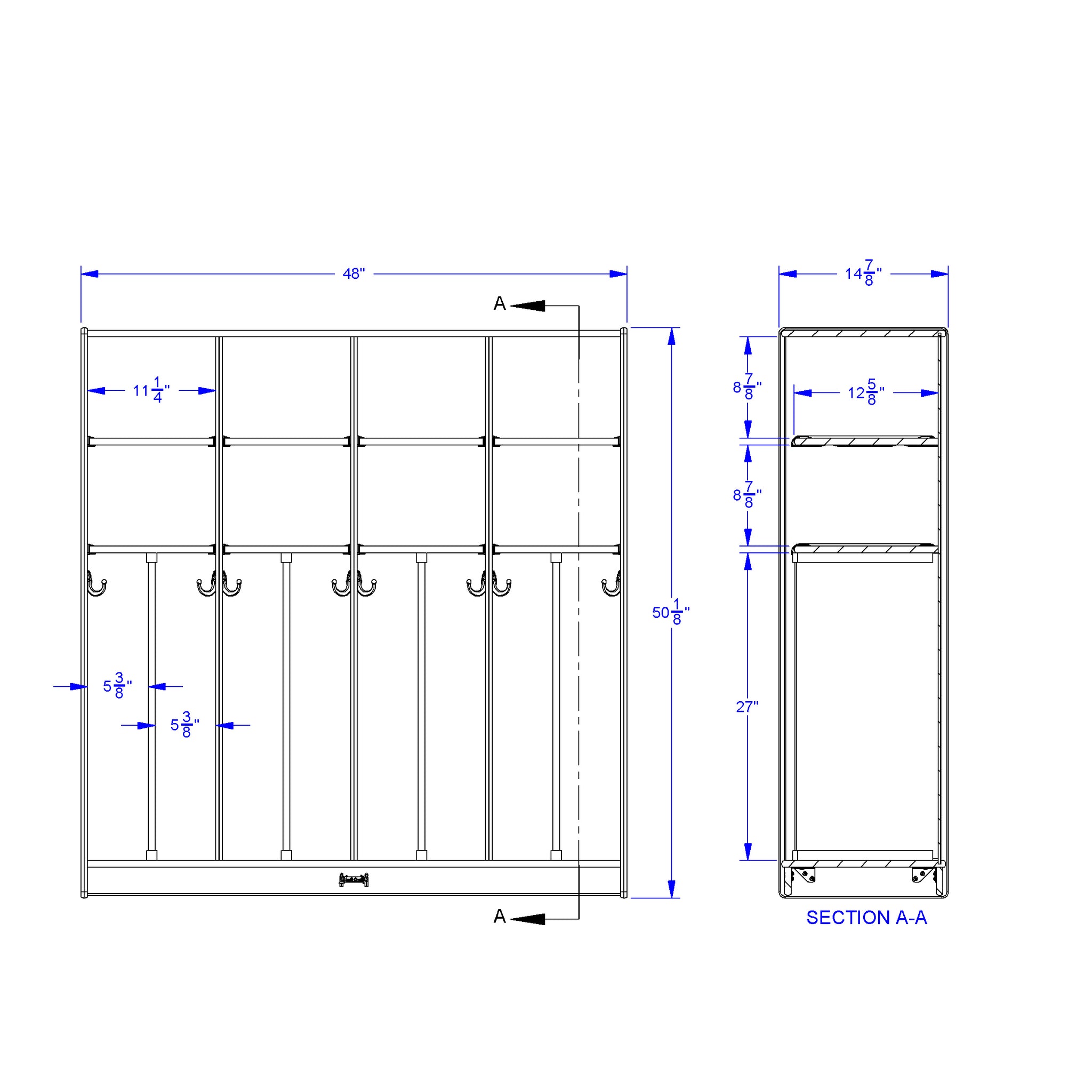 Have a small space in your entrance but need a locker with lots of storage? This eight section locker features one double coat hook is side mounted in each of the eight lockers for hanging jackets and bags. Eight open compartments above are great for storing hats and lunchboxes.