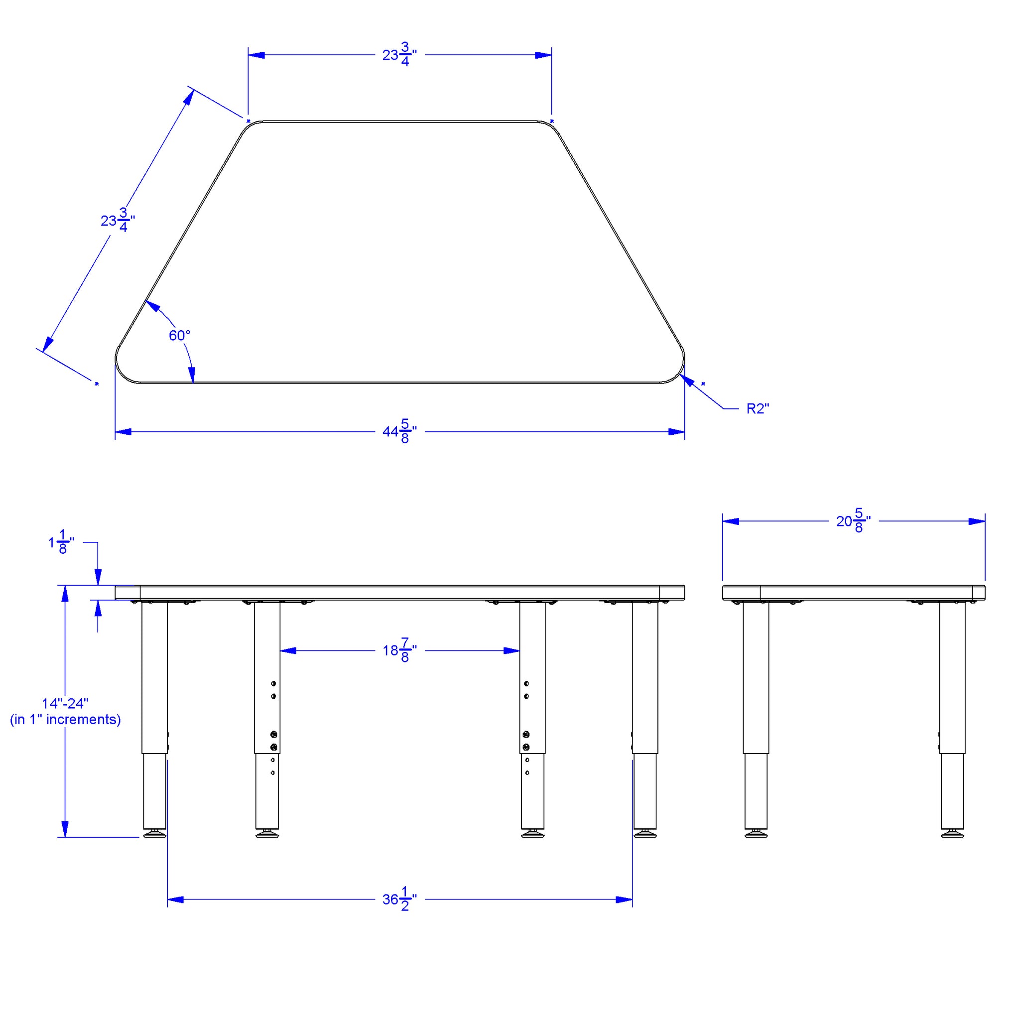 The Purpose+ Trapezoid Table is perfect for so many purposes - play, learning, art, plus more! It features adjustable legs with leveler glides making it just the right height for any early learning age. Can fit two children on the longer side of the table. Create a variety of table setups by combining multiple Trapezoid Tables together or by placing it with our Purpose+ Rectangle and Square Tables. The Maple laminate tops with Maple TRUEdge® create a seamless, natural look while providing durability. Add to your dramatic play area to create a place to “dine”.