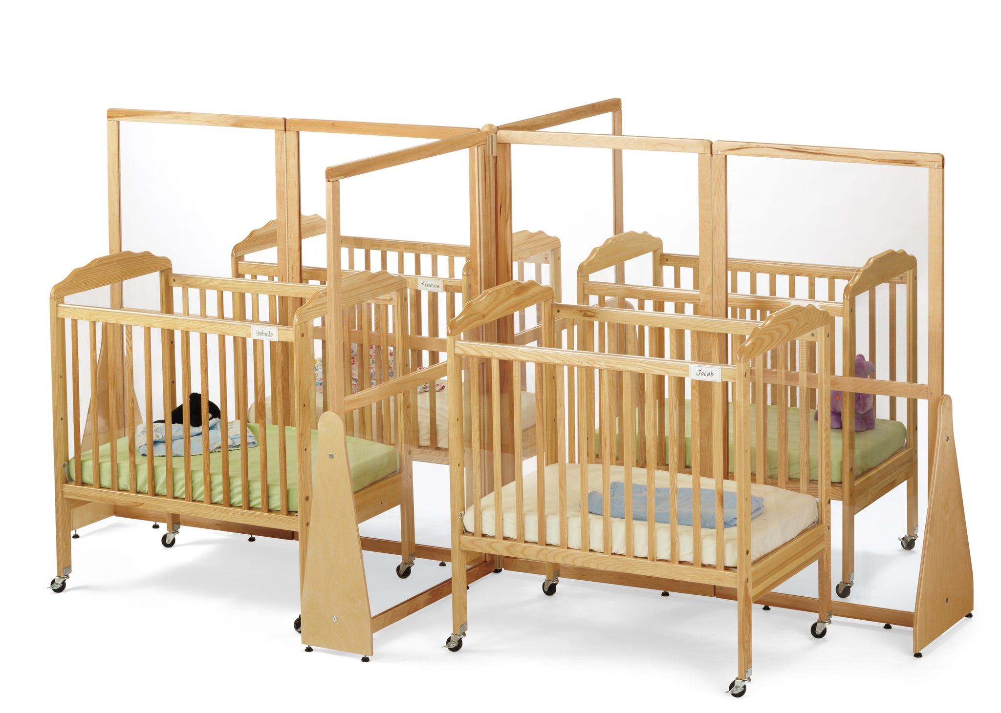 Easily keep areas separated in waiting rooms, large rooms divided, or place four closer together allowing you to make the most of your space. The group of panels not only reduces the spread of germs and airborne illnesses, but it also creates a barrier for sound. The see-thru panels allow for easy viewing and cleaning. When using these panels to divide cribs, they follow ITERS-R Personal Care Routines 8.Nap 3.2 Standards and fit with standard sized CPSIA compliant cribs. Cribs not included.