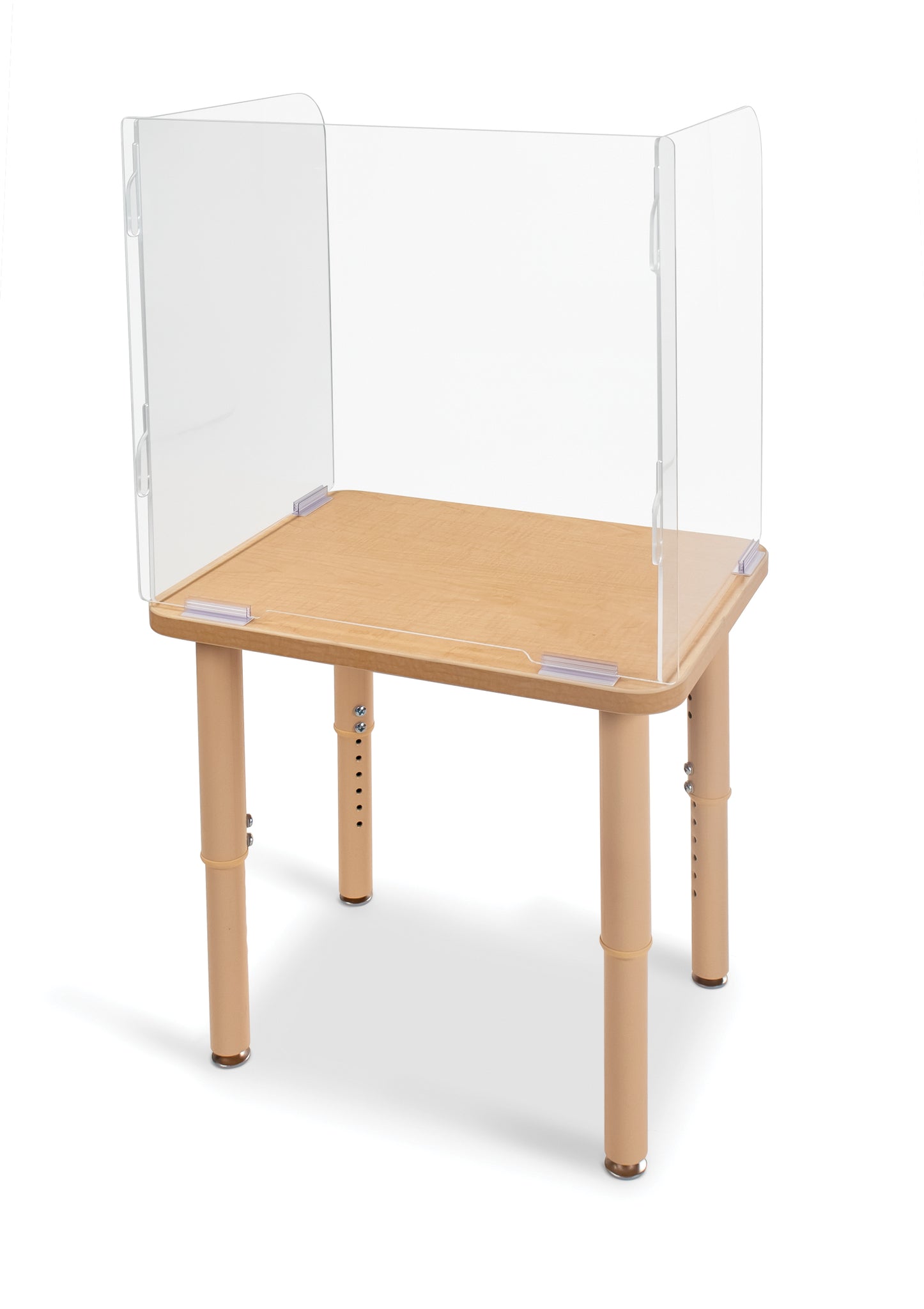 Keep students and employees protected with this Desktop Shield. The three sides of see-thru acrylic provide maximum safety and visibility and the 24” height is perfect for taller students or adults. The front panel features an 11” wide x .5” high opening at the bottom to slide papers and other small items back and forth. The hook cutouts on the side panels easily slide into slots on the front panel for quick assembly and the included four fasteners have adhesive bottoms to keep shields in place and prevent them from sliding. The side panels can be splayed out to the sides to an opening of approximately 27˝" to give children more room if desired. No tools needed for assembly. Fasteners are not reusable and additional fasteners can be purchased separately. Warning - Adult Assembly Required.
