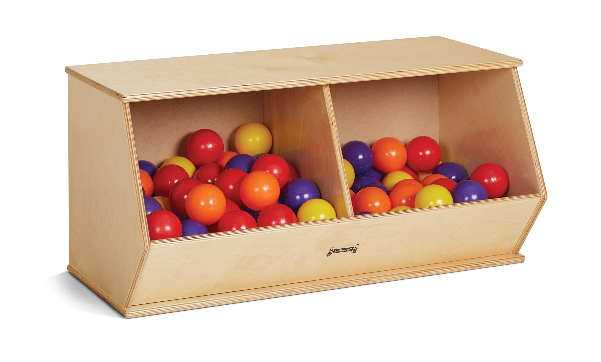 Organize toys and smaller items while keeping them within easy reach. Two storage crates side by side, each with a large opening and beveled front lip to encourage ready access to toys and more. Maximize your storage space and stack multiple units using the included hardware. Wall fastening required. Rubber feet included.