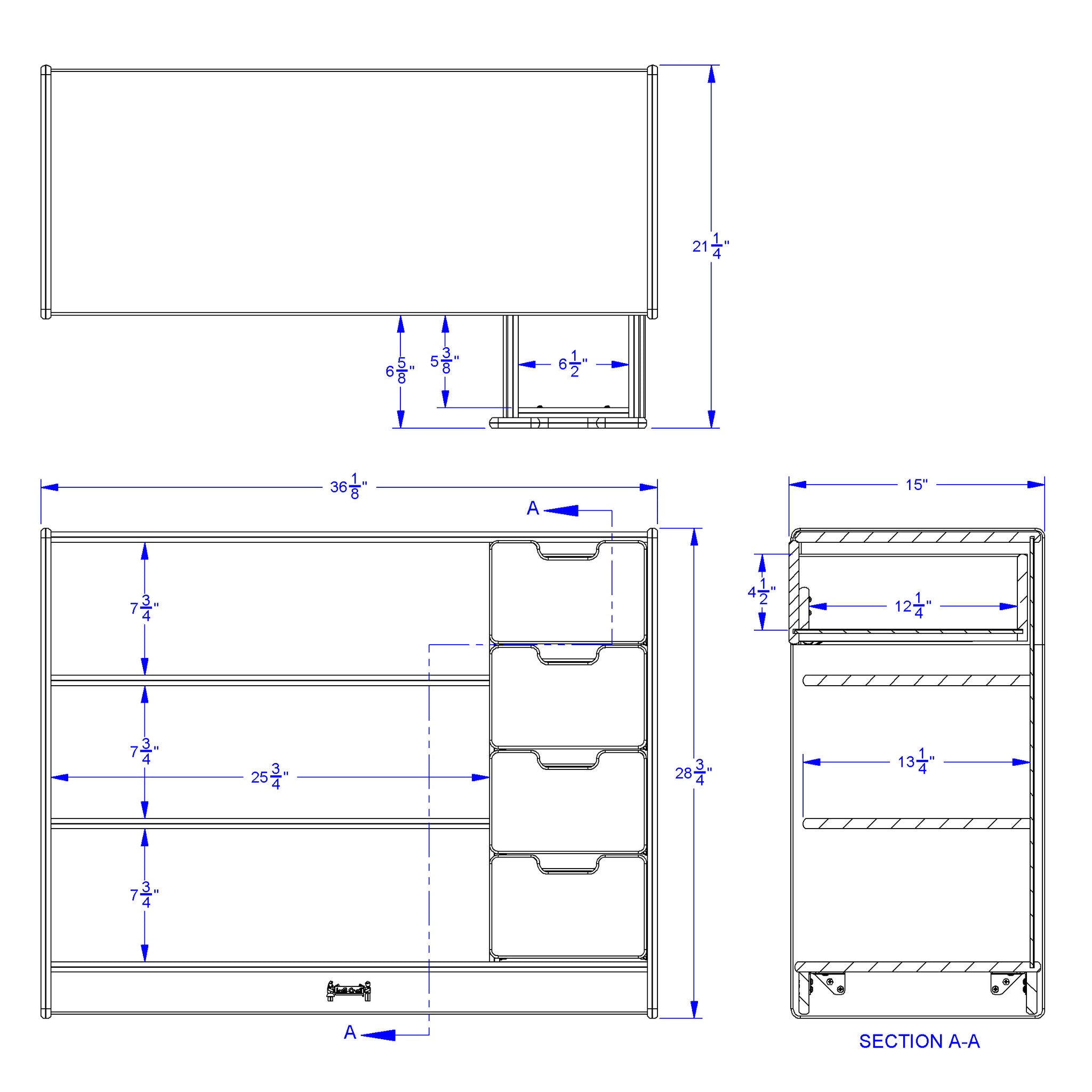 Organize large and small items on three shelves and in four drawers. Shelves are 25.5" wide x 13.5" deep x 7.5" high.
