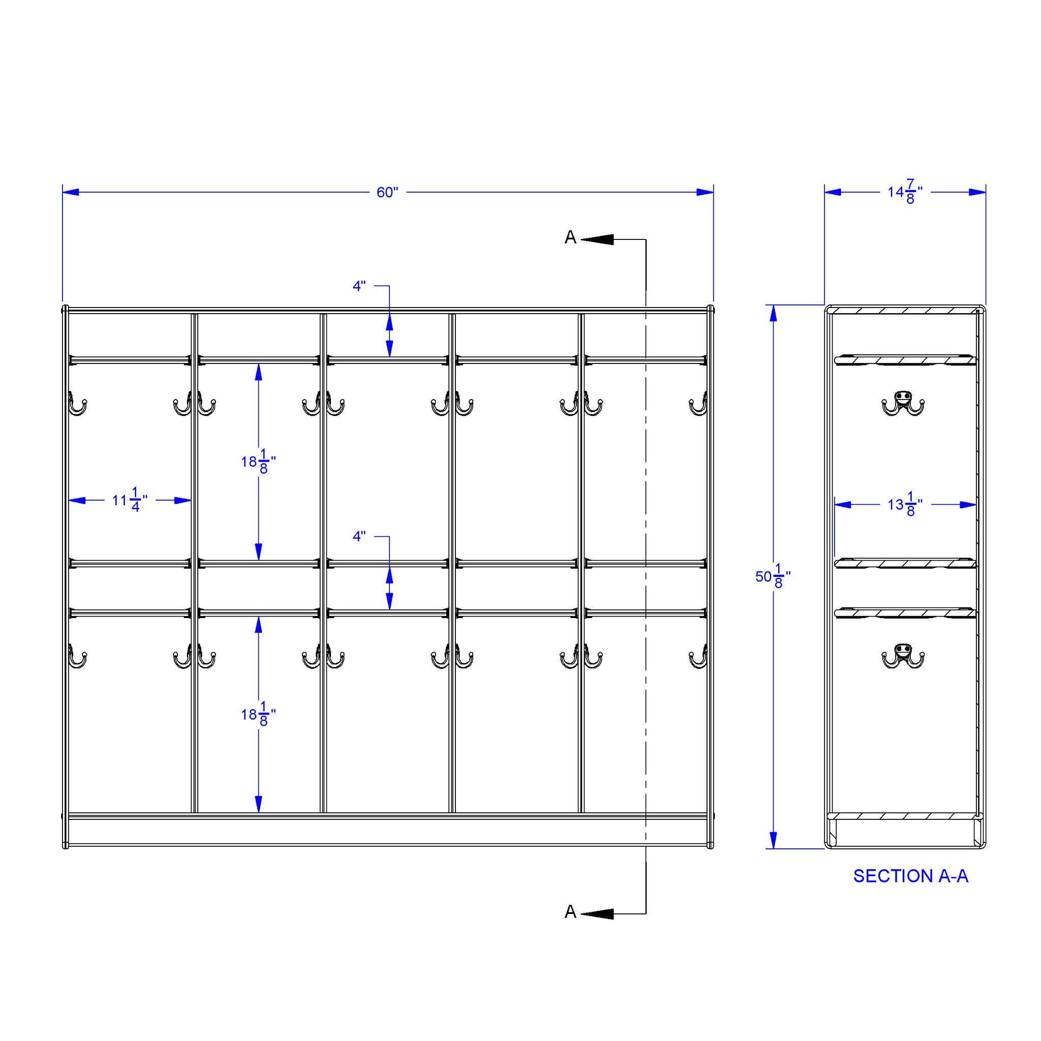 The Take Home Center features ten locker sections, each with a paper-tray slot. Excellent for organizing messages and homework. Two double hooks in each locker are perfect for hanging book bags, jackets and more.