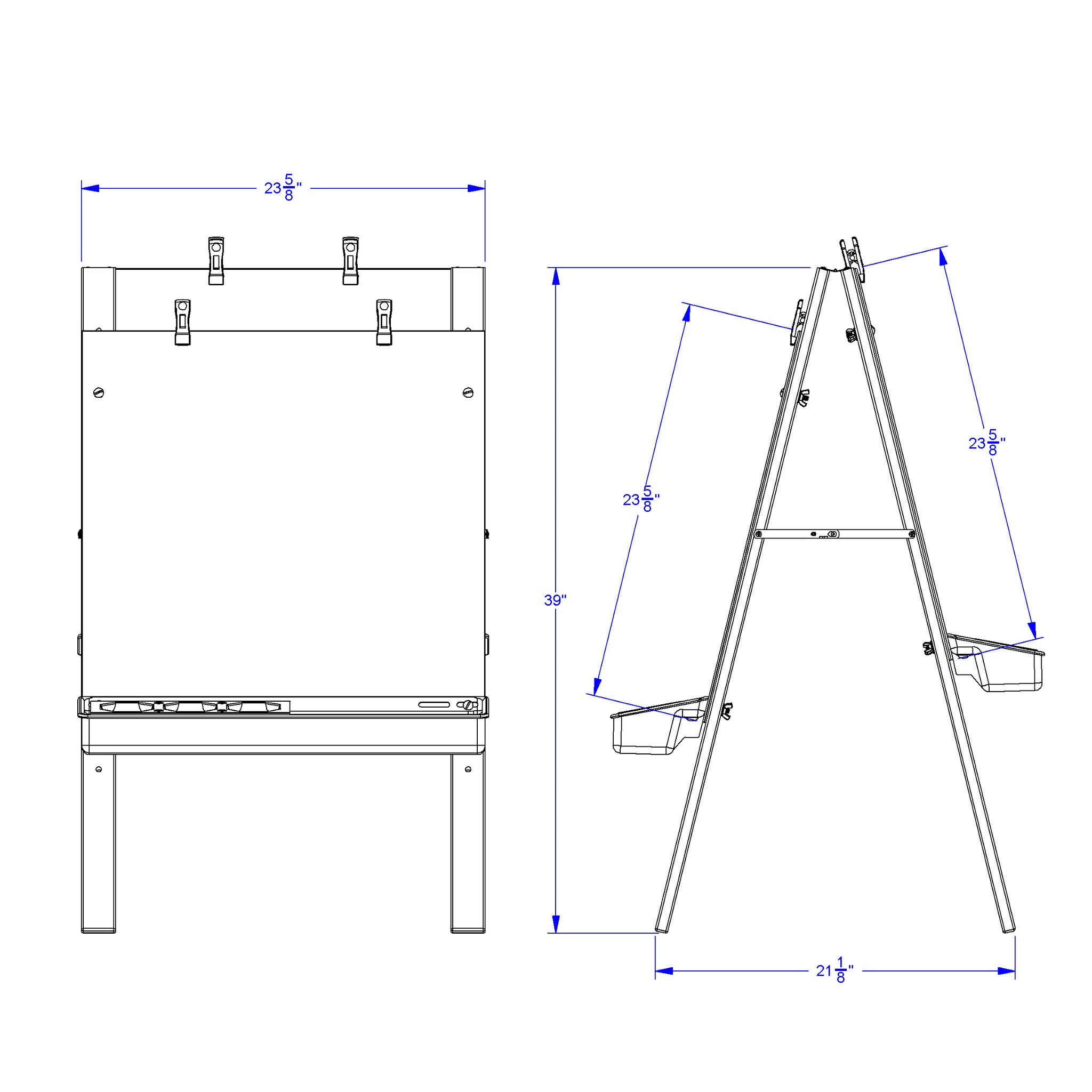 Art at a toddler's height. Hinged at top, with positive lock braces on side. Adjust the height of the double painting surfaces from 8.5" to 16" high. Comes standard with hardboard easels. Optional Acrylic, Chalkboard and Write-n-Wipe panels available. Clips and paint trays are included. Maple frame is 40" high, work panels are 24" wide and 24" high.