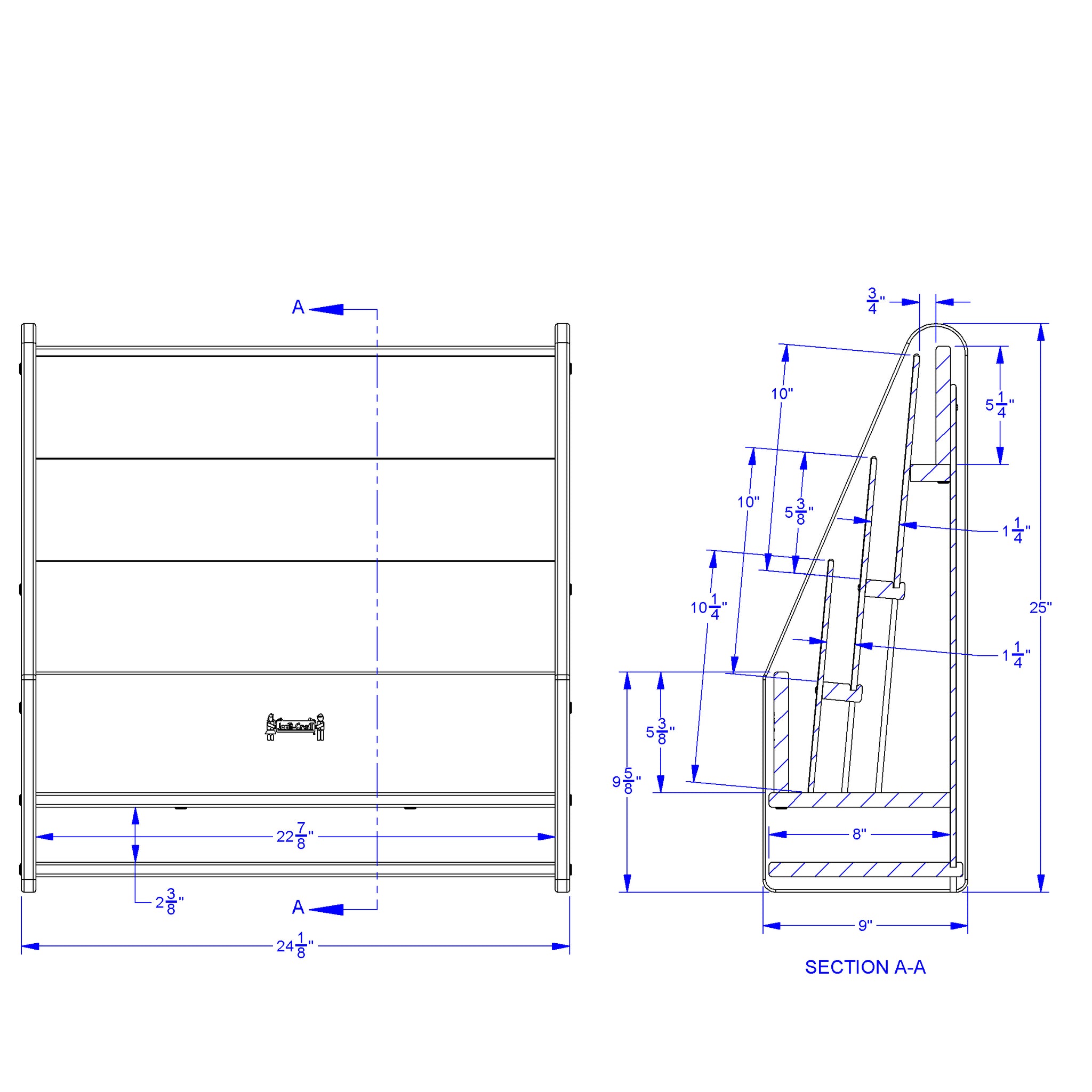 Beginner books at a toddler’s height. Three shelves approximately 1.5" deep. Added storage below slotted shelves. Write-n-Wipe back. Mobile option not available.