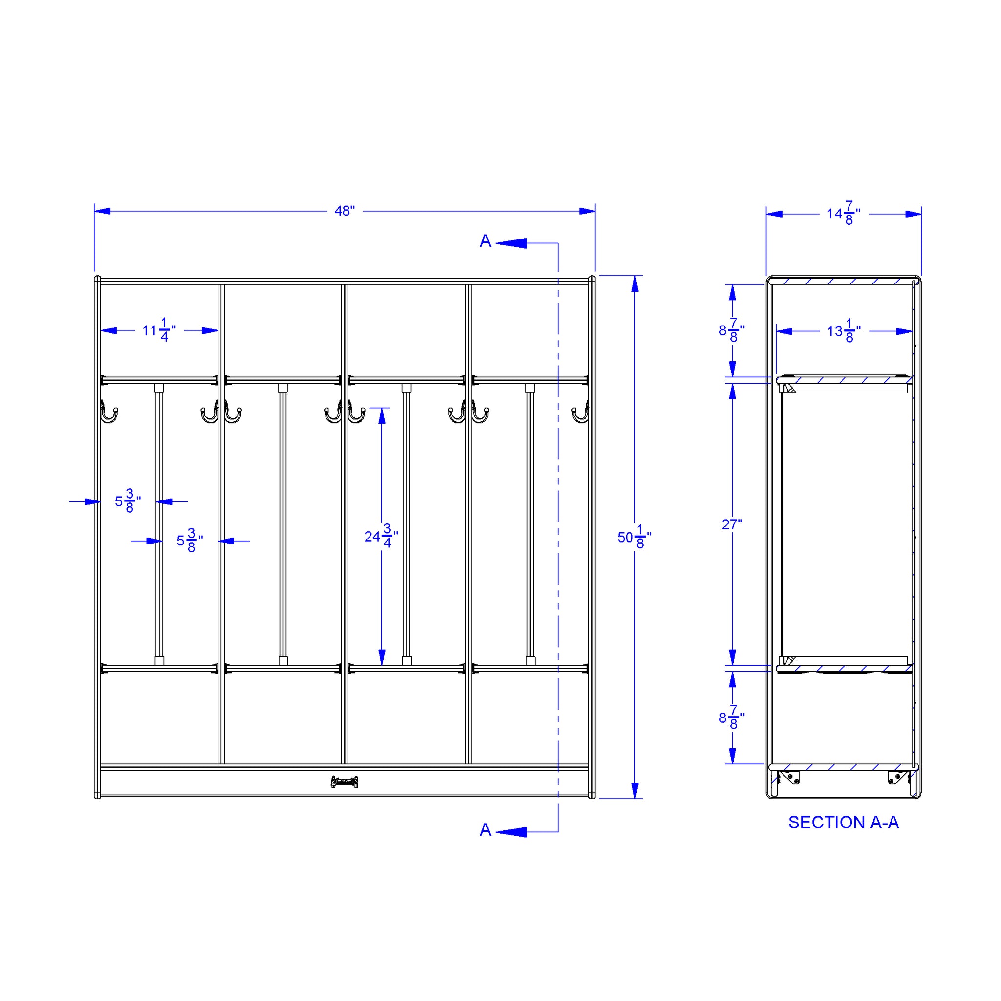 Organize your entrance space with this eight-section locker packed into a small footprint. Each vertical locker space contains a double coat hook for hanging jackets or bags while the open compartments (half above and half below) are great for storing shoes, boots, lunchboxes, and caps. Each open compartment is 11.25" wide x 13.5" deep x 8.75" high and each locker is 5.25" wide x 13.5" deep x 27" high.